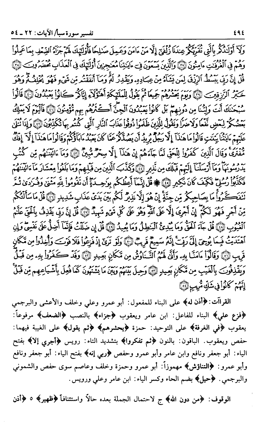 حفص ويعقوب. الباقون: بالنون ثم تفكروا بتشديد التاء: رويس أَجْرِيَ إِلَّا بفتح الياء: أبو جعفر ونافع وابن عامر وأبو عمرو وحفص ربي إنه بفتح الياء: أبو جعفر ونافع وأبو عمرو: التَّناوُشُ مهموزا: أبو عمرو وحمزة وخلف وعاصم سوى حفص والشموني والبرجمي. حِيلَ بضم الحاء وكسر الياء: ابن عامر وعلي ورويس.