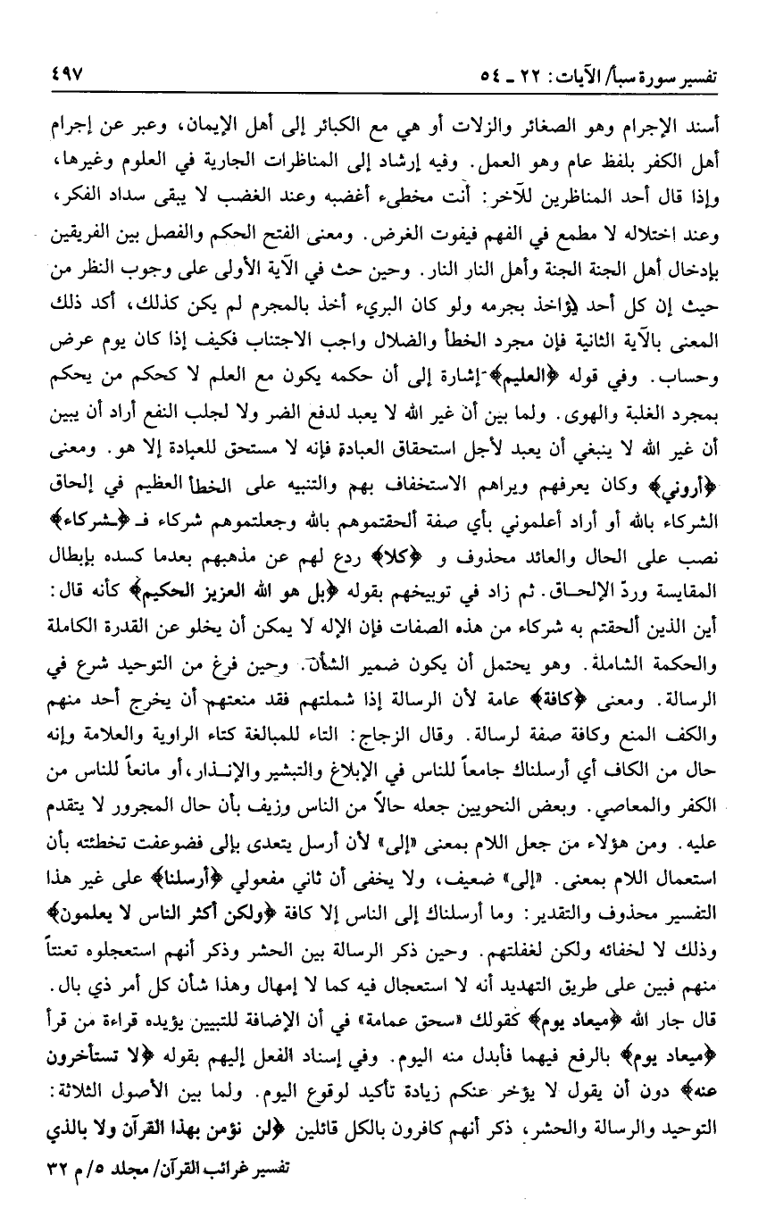 أين الذين ألحقتم به شركاء من هذه الصفات فإن الإله لا يمكن أن يخلو عن القدرة الكاملة والحكمة الشاملة. وهو يحتمل أن يكون ضمير الشأن. وحين فرغ من التوحيد شرع في الرسالة. ومعنى كَافَّةً عامة لأن الرسالة إذا شملتهم فقد منعتهم أن يخرج أحد منهم والكف المنع وكافة صفة لرسالة. وقال الزجاج: التاء للمبالغة كتاء الراوية والعلامة وإنه حال من الكاف أي أرسلناك جامعا للناس في الإبلاغ والتبشير والإنذار، أو مانعا للناس من الكفر والمعاصي. وبعض النحويين جعله حالا من الناس وزيف بأن حال المجرور لا يتقدم عليه. ومن هؤلاء من جعل اللام بمعنى «إلى» لأن أرسل يتعدى بإلى فضوعفت تخطئته بأن استعمال اللام بمعنى. «إلى» ضعيف، ولا يخفى أن ثاني مفعولي أَرْسَلْناكَ على غير هذا التفسير محذوف والتقدير: وما أرسلناك إلى الناس إلا كافة وَلكِنَّ أَكْثَرَ النَّاسِ لا يَعْلَمُونَ وذلك لا لخفائه ولكن لغفلتهم. وحين ذكر الرسالة بين الحشر وذكر أنهم استعجلوه تعنتا منهم فبين على طريق التهديد أنه لا استعجال فيه كما لا إمهال وهذا شأن كل أمر ذي بال.