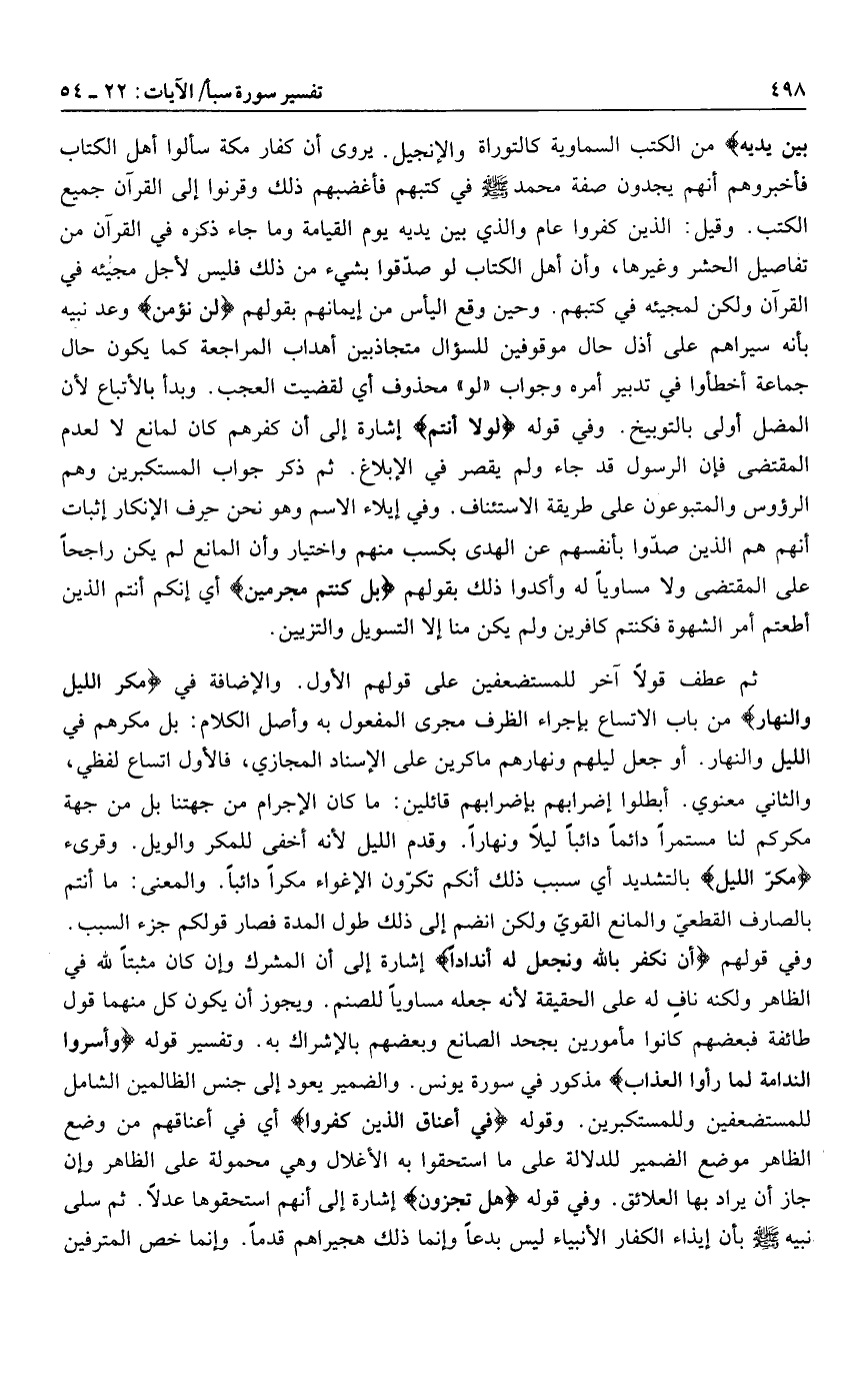 من الكتب السماوية كالتوراة والإنجيل. يروى أن كفار مكة سألوا أهل الكتاب فأخبروهم أنهم يجدون صفة محمد صلى الله عليه وسلم في كتبهم فأغضبهم ذلك وقرنوا إلى القرآن جميع الكتب. وقيل: الذين كفروا عام والذي بين يديه يوم القيامة وما جاء ذكره في القرآن من تفاصيل الحشر وغيرها، وأن أهل الكتاب لو صدّقوا بشيء من ذلك فليس لأجل مجيئه في القرآن ولكن لمجيئه في كتبهم. وحين وقع اليأس من إيمانهم بقولهم لَنْ نُؤْمِنَ وعد نبيه بأنه سيراهم على أذل حال موقوفين للسؤال متجاذبين أهداب المراجعة كما يكون حال جماعة أخطأوا في تدبير أمره وجواب «لو» محذوف أي لقضيت العجب. وبدأ بالأتباع لأن المضل أولى بالتوبيخ. وفي قوله لَوْلا أَنْتُمْ إشارة إلى أن كفرهم كان لمانع لا لعدم المقتضى فإن الرسول قد جاء ولم يقصر في الإبلاغ. ثم ذكر جواب المستكبرين وهم الرؤوس والمتبوعون على طريقة الاستئناف. وفي إيلاء الاسم وهو نحن حرف الإنكار إثبات أنهم هم الذين صدّوا بأنفسهم عن الهدى بكسب منهم واختيار وأن المانع لم يكن راجحا على المقتضى ولا مساويا له وأكدوا ذلك بقولهم بَلْ كُنْتُمْ مُجْرِمِينَ أي إنكم أنتم الذين أطعتم أمر الشهوة فكنتم كافرين ولم يكن منا إلا التسويل والتزيين.