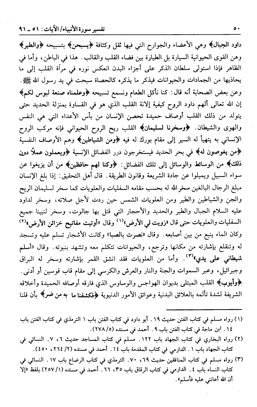 وعن بعض الصحابة أنه قال: كنا نأكل الطعام ونسمع تسبيحه وَعَلَّمْناهُ صَنْعَةَ لَبُوسٍ لَكُمْ إن الله تعالى ألهم داود الروح كيفية إلانة القلب الذي هو في القساوة بمنزلة الحديد حتى يتولد من ذلك القلب أوصاف حميدة تحصن الإنسان من بأس الأعداء التي هي النفس والهوى والشيطان. وسخرنا لِسُلَيْمانَ القلب ريح الروح الحيواني فإنه مركب الروح الإنساني به يتهيأ له السير إلى مقام بورك له فيه وَمِنَ الشَّياطِينِ وهم الأوصاف النفسية مَنْ يَغُوصُونَ لَهُ في بحر الحديد فيستخرجون درر الفضائل الإنسية وَيَعْمَلُونَ عَمَلًا دُونَ ذلِكَ من الوسائط والوسائل إلى تلك الفضائل: وَكُنَّا لَهُمْ حافِظِينَ من أن يزيغوا عن سواء السبيل ويميلوا عن جادة الشريعة وقانون الطريقة. قال أهل التحقيق: إذا بلغ الإنسان مبلغ الرجال البالغين سخر الله له بحسب مقامه السفليات والعلويات كما سخر لسليمان الريح والجن والشياطين والطير ومن العلويات الشمس حين ردت لأجل صلاته، وسخر لداود عليه السلام الجبال والطير والحديد والأحجار التي قتل بها جالوت، وسخر لنبينا جميع السفليات والعلويات حتى