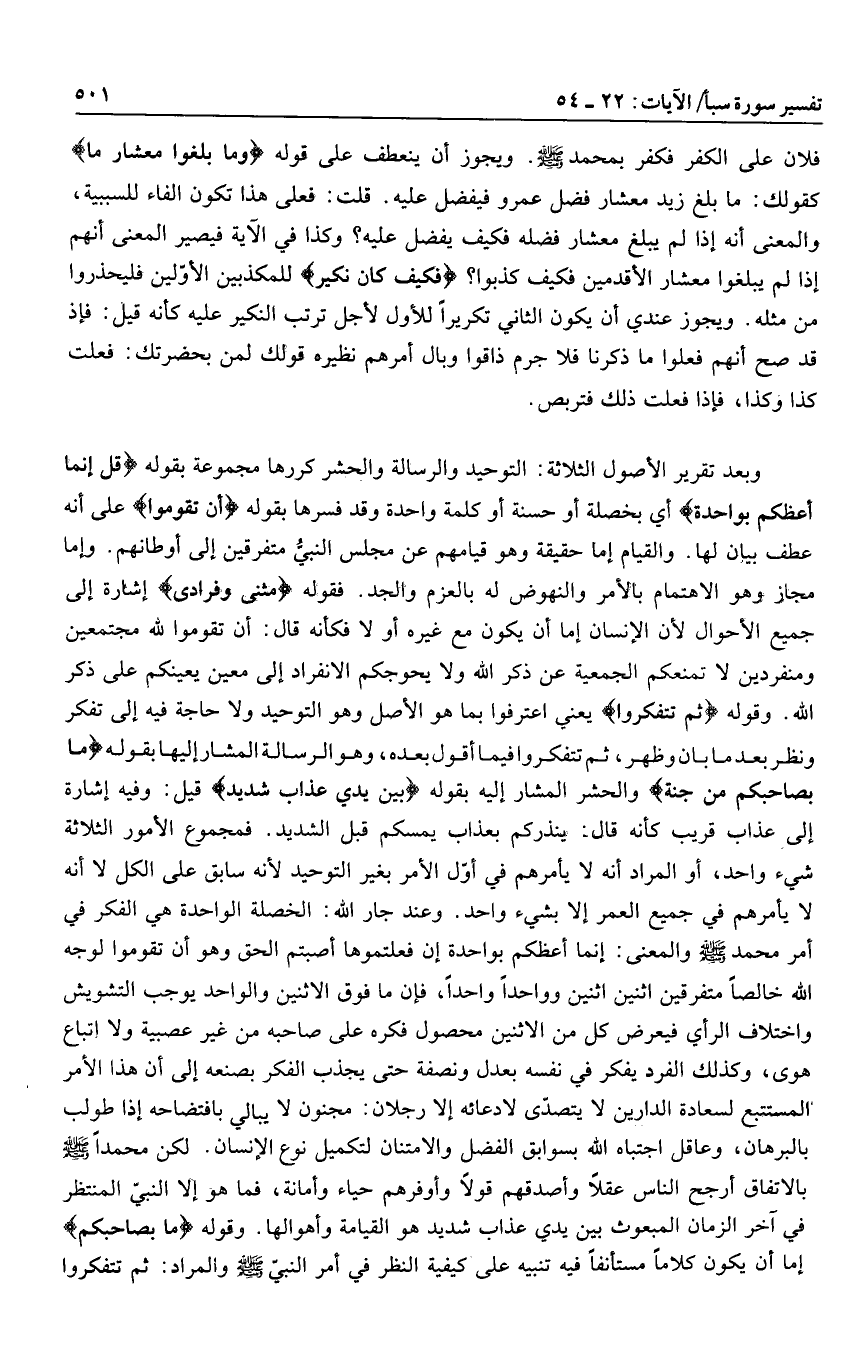 وبعد تقرير الأصول الثلاثة: التوحيد والرسالة والحشر كررها مجموعة بقوله قُلْ إِنَّما أَعِظُكُمْ بِواحِدَةٍ أي بخصلة أو حسنة أو كلمة واحدة وقد فسرها بقوله أَنْ تَقُومُوا على أنه عطف بيان لها. والقيام إما حقيقة وهو قيامهم عن مجلس النبيّ متفرقين إلى أوطانهم. وإما مجاز وهو الاهتمام بالأمر والنهوض له بالعزم والجد. فقوله مَثْنى وَفُرادى إشارة إلى جميع الأحوال لأن الإنسان إما أن يكون مع غيره أو لا فكأنه قال: أن تقوموا لله مجتمعين ومنفردين لا تمنعكم الجمعية عن ذكر الله ولا يحوجكم الانفراد إلى معين يعينكم على ذكر الله. وقوله ثُمَّ تَتَفَكَّرُوا يعني اعترفوا بما هو الأصل وهو التوحيد ولا حاجة فيه إلى تفكر ونظر بعد ما بان وظهر، ثم تتفكروا فيما أقول بعده، وهو الرسالة المشار إليها بقوله ما بِصاحِبِكُمْ مِنْ جِنَّةٍ والحشر المشار إليه بقوله بَيْنَ يَدَيْ عَذابٍ شَدِيدٍ قيل: وفيه إشارة إلى عذاب قريب كأنه قال: ينذركم بعذاب يمسكم قبل الشديد. فمجموع الأمور الثلاثة شيء واحد، أو المراد أنه لا يأمرهم في أوّل الأمر بغير التوحيد لأنه سابق على الكل لا أنه لا يأمرهم في جميع العمر إلا بشيء واحد. وعند جار الله: الخصلة الواحدة هي الفكر في أمر محمد صلى الله عليه وسلم والمعنى: إنما أعظكم بواحدة إن فعلتموها أصبتم الحق وهو أن تقوموا لوجه الله خالصا متفرقين اثنين اثنين وواحدا واحدا، فإن ما فوق الاثنين والواحد يوجب التشويش واختلاف الرأي فيعرض كل من الاثنين محصول فكره على صاحبه من غير عصبية ولا اتباع هوى، وكذلك الفرد يفكر في نفسه بعدل ونصفة حتى يجذب الفكر بصنعه إلى أن هذا الأمر المستتبع لسعادة الدارين لا يتصدّى لادعائه إلا رجلان: مجنون لا يبالي بافتضاحه إذا طولب بالبرهان، وعاقل اجتباه الله بسوابق الفضل والامتنان لتكميل نوع الإنسان. لكن محمدا صلى الله عليه وسلم بالاتفاق أرجح الناس عقلا وأصدقهم قولا وأوفرهم حياء وأمانة، فما هو إلا النبيّ المنتظر في آخر الزمان المبعوث بين يدي عذاب شديد هو القيامة وأهوالها. وقوله ما بِصاحِبِكُمْ إما أن يكون كلاما مستأنفا فيه تنبيه على كيفية النظر في أمر النبيّ صلى الله عليه وسلم والمراد: ثم تتفكروا