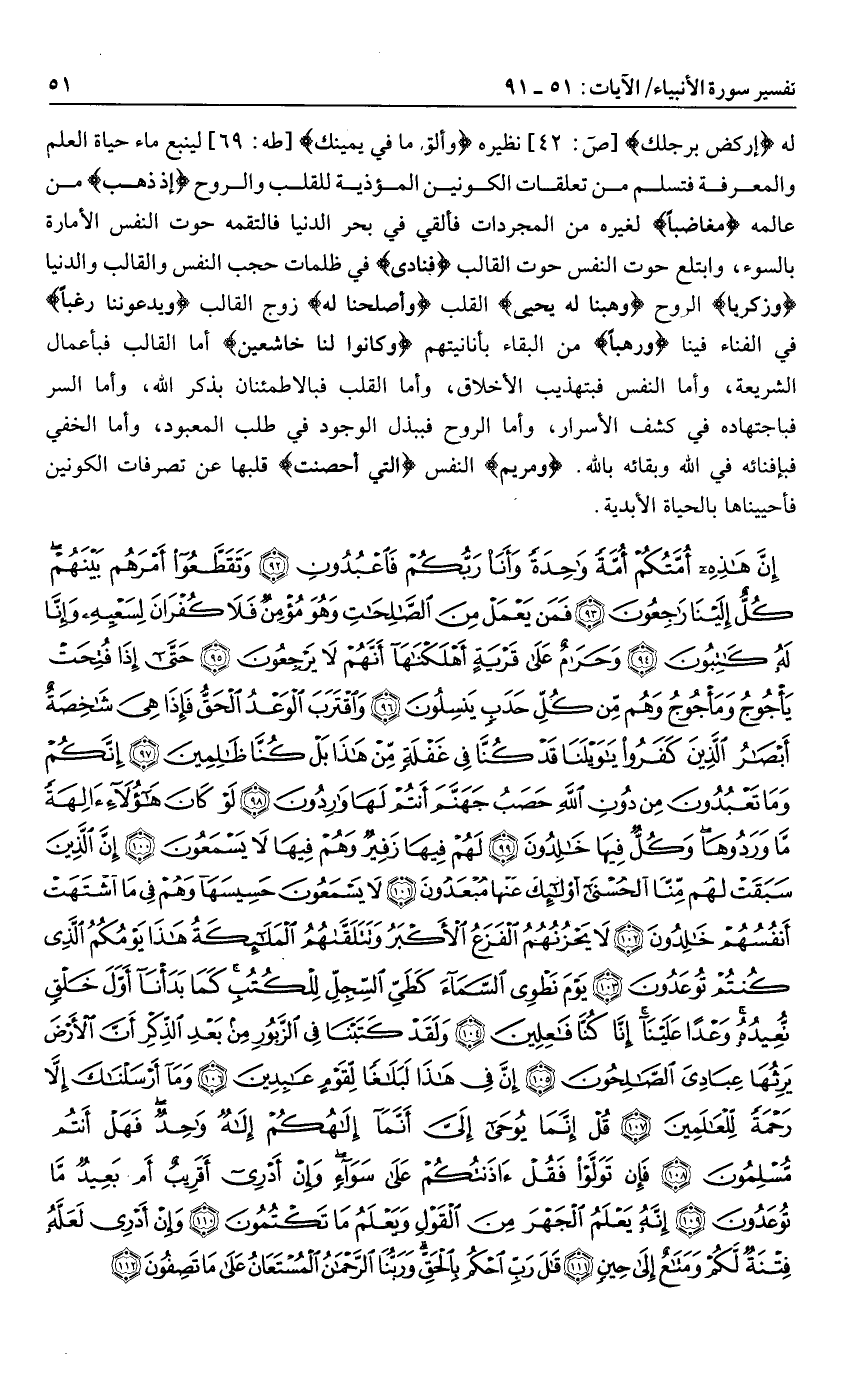 له ارْكُضْ بِرِجْلِكَ [ص: 42] نظيره وَأَلْقِ ما فِي يَمِينِكَ [طه: 69] لينبع ماء حياة العلم والمعرفة فتسلم من تعلقات الكونين المؤذية للقلب والروح إِذْ ذَهَبَ من عالمه مُغاضِباً لغيره من المجردات فألقي في بحر الدنيا فالتقمه حوت النفس الأمارة بالسوء، وابتلع حوت النفس حوت القالب فَنادى في ظلمات حجب النفس والقالب والدنيا وَزَكَرِيَّا الروح وَهَبْنا لَهُ يَحْيى القلب وَأَصْلَحْنا لَهُ زوج القالب وَيَدْعُونَنا رَغَباً في الفناء فينا وَرَهَباً من البقاء بأنانيتهم وَكانُوا لَنا خاشِعِينَ أما القالب فبأعمال الشريعة، وأما النفس فبتهذيب الأخلاق، وأما القلب فبالاطمئنان بذكر الله، وأما السر فباجتهاده في كشف الأسرار، وأما الروح فببذل الوجود في طلب المعبود، وأما الخفي فبإفنائه في الله وبقائه بالله. وَمَرْيَمَ النفس الَّتِي أَحْصَنَتْ قلبها عن تصرفات الكونين فأحييناها بالحياة الأبدية.