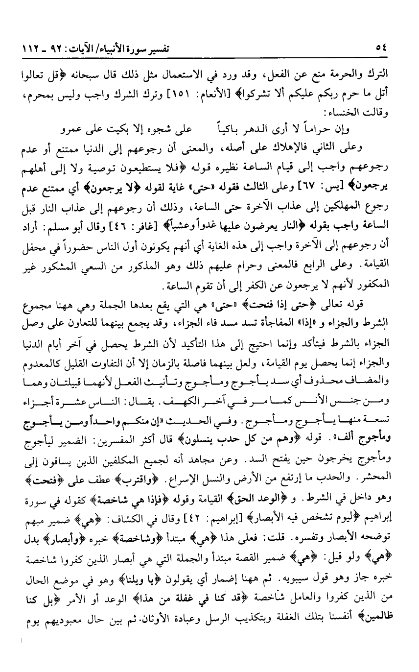 قوله تعالى حَتَّى إِذا فُتِحَتْ «حتى» هي التي يقع بعدها الجملة وهي هاهنا مجموع الشرط والجزاء و «إذا» المفاجأة تسد مسد فاء الجزاء، وقد يجمع بينهما للتعاون على وصل الجزاء بالشرط فيتأكد وإنما احتيج إلى هذا التأكيد لأن الشرط يحصل في آخر أيام الدنيا والجزاء إنما يحصل يوم القيامة، ولعل بينهما فاصلة بالزمان إلا أن التفاوت القليل كالمعدوم والمضاف محذوف أي سد يأجوج ومأجوج وتأنيث الفعل لأنهما قبيلتان وهما ومن جنس الأنس كما مر في آخر الكهف. يقال: الناس عشرة أجزاء تسعة منها يأجوج ومأجوج.