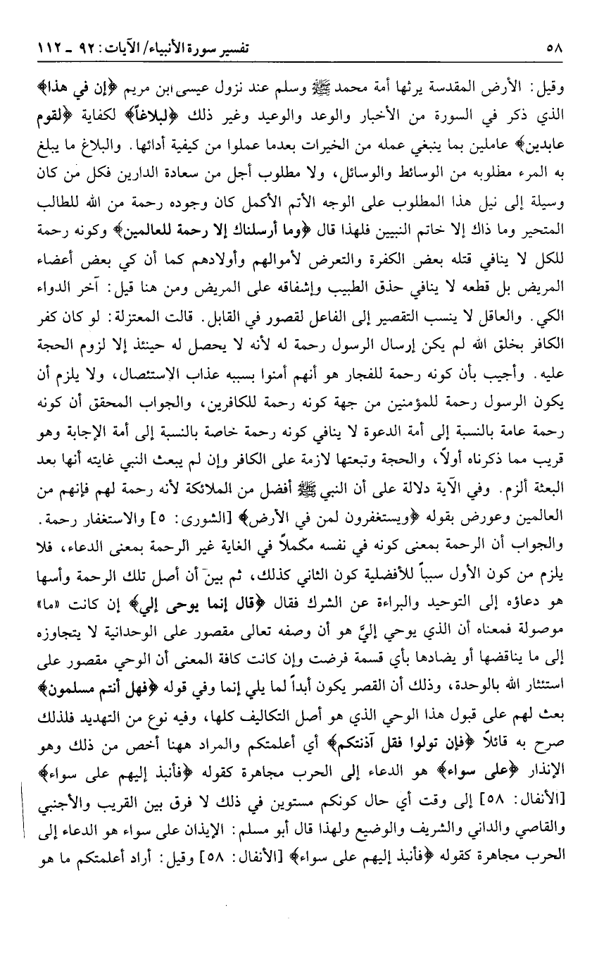 وقيل: الأرض المقدسة يرثها أمة محمد صلى الله عليه وسلم وسلم عند نزول عيسى بن مريم إِنَّ فِي هذا الذي ذكر في السورة من الأخبار والوعد والوعيد وغير ذلك لَبَلاغاً لكفاية لِقَوْمٍ عابِدِينَ عاملين بما ينبغي عمله من الخيرات بعد ما عملوا من كيفية أدائها. والبلاغ ما يبلغ به المرء مطلوبه من الوسائط والوسائل، ولا مطلوب أجل من سعادة الدارين فكل من كان وسيلة إلى نيل هذا المطلوب على الوجه الأتم الأكمل كان وجوده رحمة من الله للطالب المتحير وما ذاك إلا خاتم النبيين فلهذا قال وَما أَرْسَلْناكَ إِلَّا رَحْمَةً لِلْعالَمِينَ وكونه رحمة للكل لا ينافي قتله بعض الكفرة والتعرض لأموالهم وأولادهم كما أن كي بعض أعضاء المريض بل قطعه لا ينافي حذق الطبيب وإشفاقه على المريض ومن هنا قيل: آخر الدواء الكي. والعاقل لا ينسب التقصير إلى الفاعل لقصور في القابل. قالت المعتزلة: لو كان كفر الكافر بخلق الله لم يكن إرسال الرسول رحمة له لأنه لا يحصل له حينئذ إلا لزوم الحجة عليه. وأجيب بأن كونه رحمة للفجار هو أنهم أمنوا بسببه عذاب الاستئصال، ولا يلزم أن يكون الرسول رحمة للمؤمنين من جهة كونه رحمة للكافرين، والجواب المحقق أن كونه رحمة عامة بالنسبة إلى أمة الدعوة لا ينافي كونه رحمة خاصة بالنسبة إلى أمة الإجابة وهو قريب مما ذكرناه أولا، والحجة وتبعتها لازمة على الكافر وإن لم يبعث النبي غايته أنها بعد البعثة ألزم. وفي الآية دلالة على أن النبي صلى الله عليه وسلم أفضل من الملائكة لأنه رحمة لهم فإنهم من العالمين وعورض بقوله وَيَسْتَغْفِرُونَ لِمَنْ فِي الْأَرْضِ [الشورى: 5] والاستغفار رحمة.