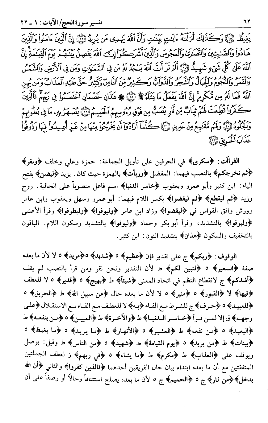 هـ مَرِيدٍ هـ لا لأن ما بعده صفة السَّعِيرِ هـ لِنُبَيِّنَ لَكُمْ ط لأن التقدير ونحن نقر ومن قرأ بالنصب لم يقف أَشُدَّكُمْ ج لانقطاع النظم في اتحاد المعنى شَيْئاً ط بَهِيجٍ هـ قَدِيرٌ هـ لا للعطف فِيها لا الْقُبُورِ هـ مُنِيرٍ هـ لا لأن ما بعده حال عَنْ سَبِيلِ اللَّهِ ط الْحَرِيقِ هـ لِلْعَبِيدِ هـ حَرْفٍ ج للشرط مع الفاء بِهِ لا للعطف مع الفاء مع الاستقلال عَلى وَجْهِهِ ق إلا لمن قرأ خاسر الدنيا ط وَالْآخِرَةَ ط الْمُبِينُ هـ من ينفعه ط الْبَعِيدُ هـ مِنْ نَفْعِهِ ط الْعَشِيرُ هـ الْأَنْهارُ ط ما يُرِيدُ هـ ما يَغِيظُ هـ بَيِّناتٍ ط مَنْ يُرِيدُ هـ يَوْمَ الْقِيامَةِ ط شَهِيدٌ هـ مِنَ النَّاسِ ط وقيل: يوصل ويوقف على الْعَذابُ ط مُكْرِمٍ ط ما يَشاءُ هـ فِي رَبِّهِمْ ز لعطف الجملتين المتفقتين مع أن ما بعده ابتداء بيان حال الفريقين أحدهما فَالَّذِينَ كَفَرُوا والثاني إِنَّ اللَّهَ يُدْخِلُ مِنْ نارٍ ج هـ الْحَمِيمُ ج هـ لأن ما بعده يصلح استئنافا وحالا أو وصفا على أن