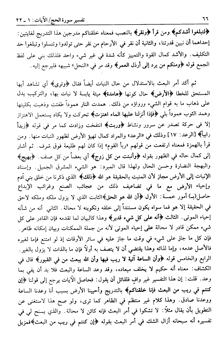 الرابع والخامس قوله وَأَنَّ السَّاعَةَ آتِيَةٌ لا رَيْبَ فِيها وَأَنَّ اللَّهَ يَبْعَثُ مَنْ فِي الْقُبُورِ قال في الكشاف: معناه أنه حكيم لا يخلف ميعاده، وقد وعد الساعة والبعث فلا بد أن يفي بما وعد. قلت: إن هذا التفسير غير واف فلقائل أن يقول: فحاصل الآيات يرجع إلى قولنا إِنْ كُنْتُمْ فِي رَيْبٍ مِنَ الْبَعْثِ فَإِنَّا خَلَقْناكُمْ بالتدريج وأحيينا الأرض بسبب أنا وعدنا الساعة ووعدنا صادق. وهذا كلام غير منتظم في الظاهر كما ترى، ولو صح هذا لاستغنى عن التطويل بأن يقال مثلا: لا تشكوا في أمر البعث فإنه كائن لا محالة. والذي يسنح لي في تفسيره أنه سبحانه أزال الشك في أمر البعث بقوله إِنْ كُنْتُمْ فِي رَيْبٍ مِنَ الْبَعْثِ فمزيل