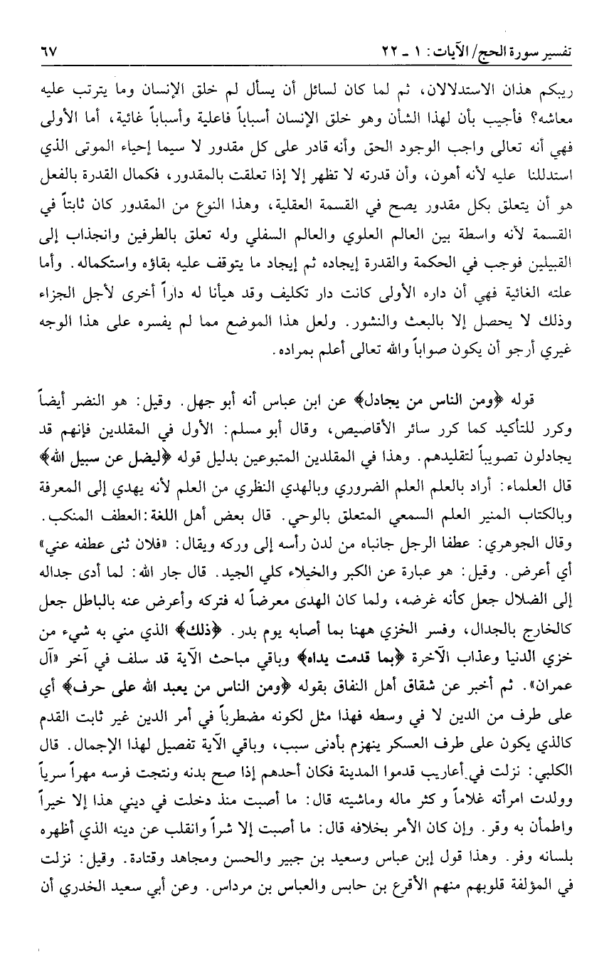 قوله وَمِنَ النَّاسِ مَنْ يُجادِلُ عن ابن عباس أنه أبو جهل. وقيل: هو النضر أيضا وكرر للتأكيد كما كرر سائر الأقاصيص، وقال أبو مسلم: الأول في المقلدين فإنهم قد يجادلون تصويبا لتقليدهم. وهذا في المقلدين المتبوعين بدليل قوله لِيُضِلَّ عَنْ سَبِيلِ اللَّهِ قال العلماء: أراد بالعلم العلم الضروري وبالهدي النظري من العلم لأنه يهدي إلى المعرفة وبالكتاب المنير العلم السمعي المتعلق بالوحي. قال بعض أهل اللغة: العطف المنكب.