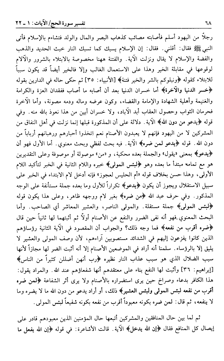 والفتنة هاهنا مخصوصة بالابتلاء بالشرور والآلام لوقوعها في مقابلة الخير وهذا على الاستعمال الغالب وإلا فالخير أيضا قد يكون سببا للابتلاء كقوله وَنَبْلُوكُمْ بِالشَّرِّ وَالْخَيْرِ فِتْنَةً [الأنبياء: 35] ثم حكى حاله في الدارين بقوله خَسِرَ الدُّنْيا وَالْآخِرَةَ أما خسران الدنيا بعد أن أصابه ما أصاب ففقدان العزة والكرامة والغنيمة وأهلية الشهادة والإمامة والقضاء، وكون عرضه وماله ودمه مصونة، وأما الآخرة فحرمان الثواب وحصول العقاب أبد الآباد، ولا خسران أبين من هذا نعوذ بالله منه. وفي قوله يَدْعُوا مِنْ دُونِ اللَّهِ الآية. دلالة على أن المذكورة قبلها إنما نزلت في أهل النفاق من المشركين لا من اليهود فإنهم لا يعبدون الأصنام نعم اتخذوا أحبارهم ورهبانهم أربابا من دون الله. قوله يَدْعُوا لَمَنْ ضَرُّهُ الآية. فيه بحث لفظي وبحث معنوي. أما الأول فهو أن يَدْعُوا بمعنى «يقول» والجملة بعده محكية، و «من» موصولة أو موصوفة وعلى التقديرين هو مع تمامه مبتدأ ما بعده وهو لَبِئْسَ الْمَوْلى خبره واللام الثانية في الخبر لتأكيد اللام الأولى، وهذا حسن بخلاف قوله «أم الحليس لعجوز» فإنه أدخل لام الابتداء في الخبر على سبيل الاستقلال ويجوز أن يكون يَدْعُوا تكرارا للأول وما بعده جملة مستأنفة على الوجه المذكور. وفي حرف عبد الله لَمَنْ ضَرُّهُ بغير لام ووجهه ظاهر، وعلى هذا يكون قوله لَبِئْسَ الْمَوْلى جملة مستقلة. والمولى الناصر، والعشير المعاشر أي الصاحب. وأما البحث المعنوي. فهو أنه نفى الضرر والنفع عن الأصنام أولا ثم أثبتهما لها ثانيا حين قال ضَرُّهُ أَقْرَبُ مِنْ نَفْعِهِ فما وجه ذلك؟ والجواب أن المقصود في الآية الثانية رؤساؤهم الذين كانوا يفزعون إليهم في الشدائد مستصوبين آراءهم، لأن وصف المولى والعشير لا يليق إلا بالرؤساء. سلمنا أنه أراد في الموضعين الأصنام إلا أنه أثبت الضر لها مجازا لأنها سبب الضلال الذي هو سبب عذاب النار نظيره رَبِّ إِنَّهُنَّ أَضْلَلْنَ كَثِيراً مِنَ النَّاسِ [إبراهيم: 36] وأثبت لها النفع بناء على معتقدهم أنها شفعاؤهم عند الله. والمراد يقول: