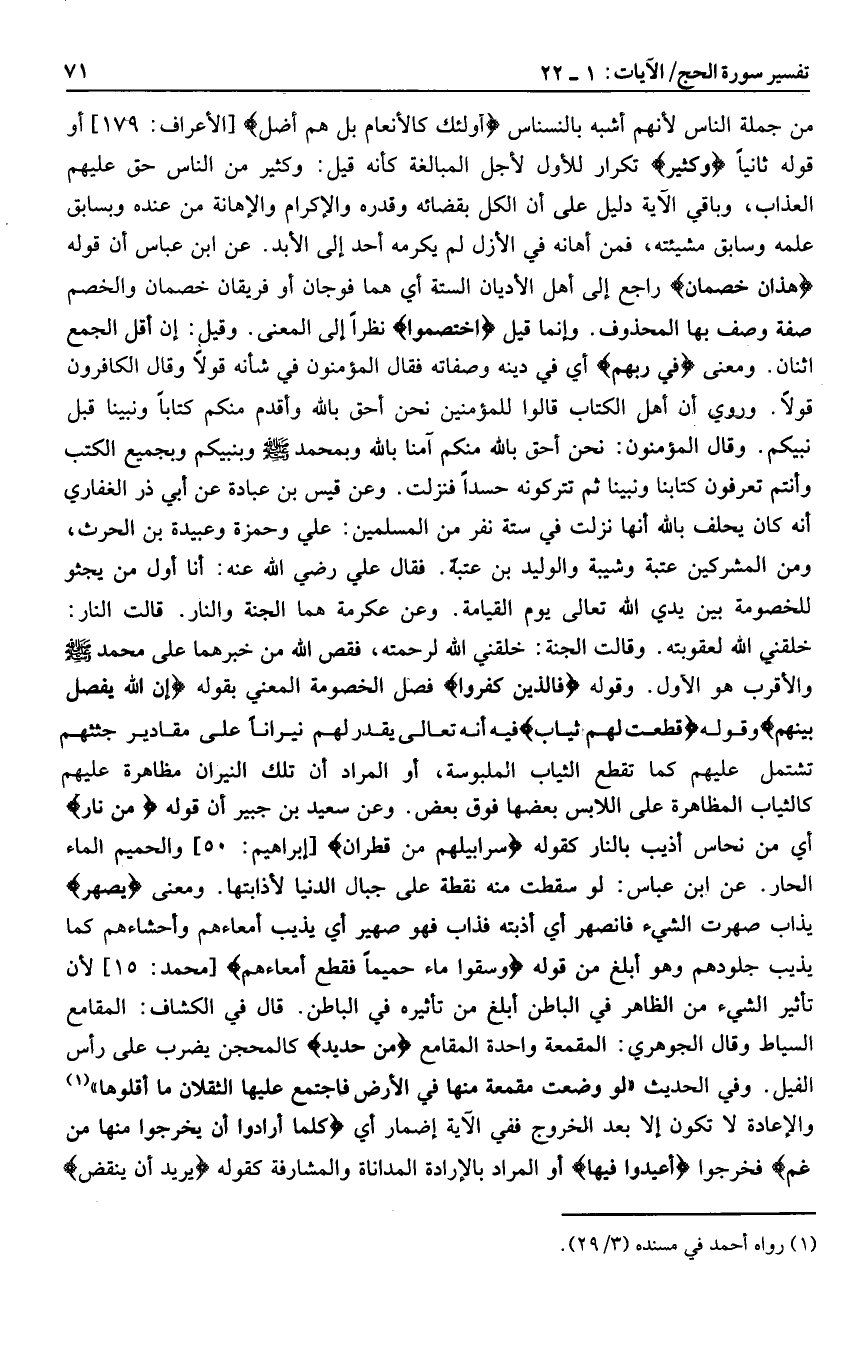 من جملة الناس لأنهم أشبه بالنسناس أُولئِكَ كَالْأَنْعامِ بَلْ هُمْ أَضَلُّ [الأعراف: 179] أو قوله ثانيا وَكَثِيرٌ تكرار للأول لأجل المبالغة كأنه قيل: وكثير من الناس حق عليهم العذاب، وباقي الآية دليل على أن الكل بقضائه وقدره والإكرام والإهانة من عنده وبسابق علمه وسابق مشيئته، فمن أهانه في الأزل لم يكرمه أحد إلى الأبد. عن ابن عباس أن قوله هذانِ خَصْمانِ راجع إلى أهل الأديان الستة أي هما فوجان أو فريقان خصمان والخصم صفة وصف بها المحذوف. وإنما قيل اخْتَصَمُوا نظرا إلى المعنى. وقيل: إن أقل الجمع اثنان. ومعنى فِي رَبِّهِمْ أي في دينه وصفاته فقال المؤمنون في شأنه قولا وقال الكافرون قولا. وروي أن أهل الكتاب قالوا للمؤمنين نحن أحق بالله وأقدم منكم كتابا ونبينا قبل نبيكم. وقال المؤمنون: نحن أحق بالله منكم آمنا بالله وبمحمد صلى الله عليه وسلم وبنبيكم وبجميع الكتب وأنتم تعرفون كتابنا ونبينا ثم تتركونه حسدا فنزلت. وعن قيس بن عبادة عن أبي ذر الغفاري أنه كان يحلف بالله أنها نزلت في ستة نفر من المسلمين: علي وحمزة وعبيدة بن الحرث، ومن المشركين عتبة وشيبة والوليد بن عتبة.