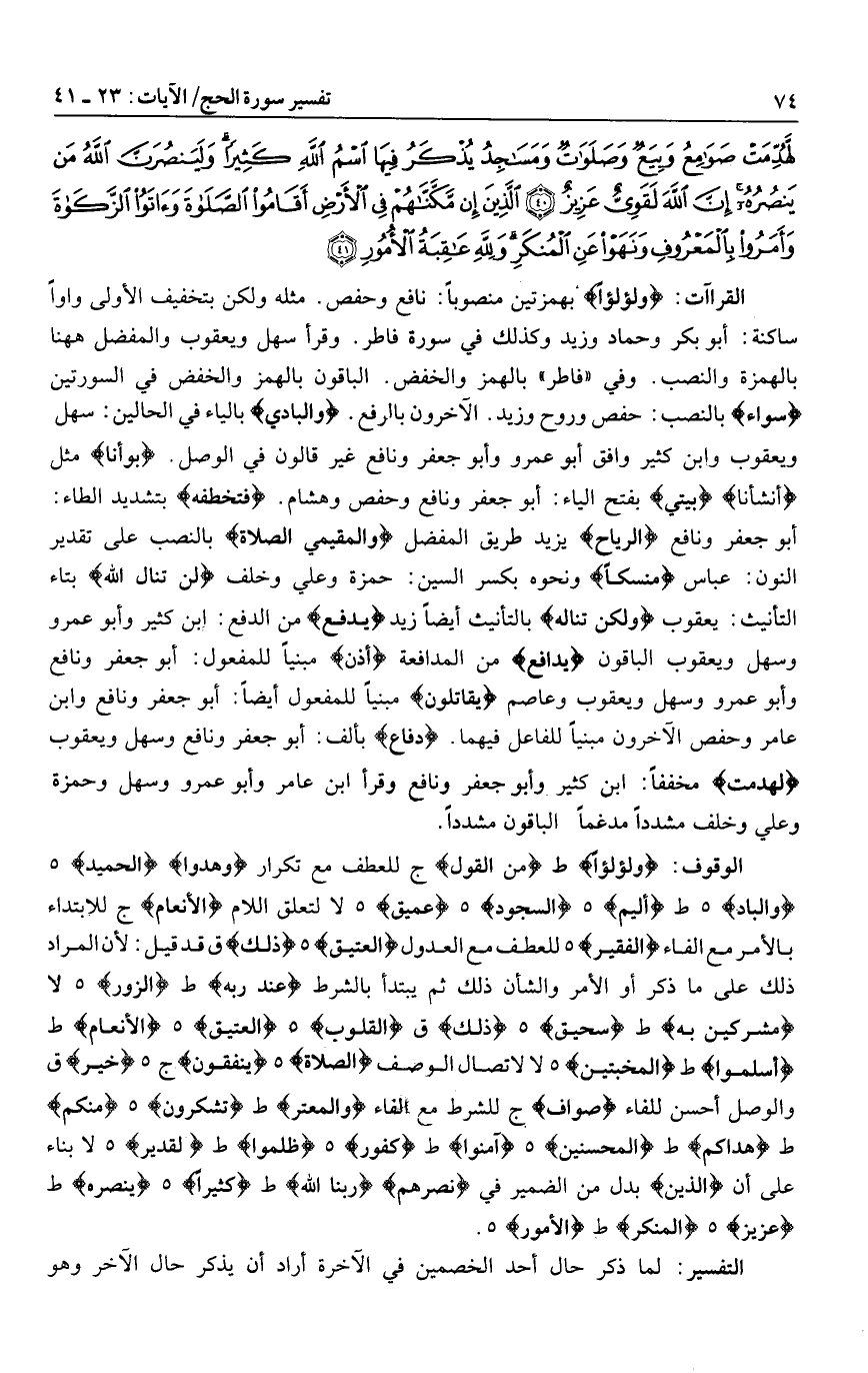 وَلُؤْلُؤاً ط مِنَ الْقَوْلِ ج للعطف مع تكرار وَهُدُوا الْحَمِيدِ هـ وَالْبادِ هـ ط أَلِيمٍ هـ السُّجُودِ هـ عَمِيقٍ هـ لا لتعلق اللام الْأَنْعامِ ج للابتداء بالأمر مع الفاء الْفَقِيرَ هـ للعطف مع العدول الْعَتِيقِ هـ ذلِكَ ق قد قيل: لأن المراد ذلك على ما ذكر أو الأمر والشأن ذلك ثم يبتدأ بالشرط عِنْدَ رَبِّهِ ط الزُّورِ هـ لا مُشْرِكِينَ بِهِ ط سَحِيقٍ هـ ذلِكَ ق الْقُلُوبِ هـ الْعَتِيقِ هـ الْأَنْعامِ ط أَسْلِمُوا ط الْمُخْبِتِينَ هـ لا لاتصال الوصف الصَّلاةِ هـ يُنْفِقُونَ ج هـ خَيْرٌ ق والوصل أحسن للفاء صَوافَّ ج للشرط مع الفاء وَالْمُعْتَرَّ ط تَشْكُرُونَ هـ مِنْكُمْ ط هَداكُمْ ط الْمُحْسِنِينَ هـ آمَنُوا ط كَفُورٍ هـ ظُلِمُوا ط لَقَدِيرٌ هـ لا بناء على أن الَّذِينَ بدل من الضمير في نَصْرِهِمْ رَبُّنَا اللَّهُ ط كَثِيراً هـ يَنْصُرُهُ ط عَزِيزٌ هـ الْمُنْكَرِ ط الْأُمُورِ هـ.
