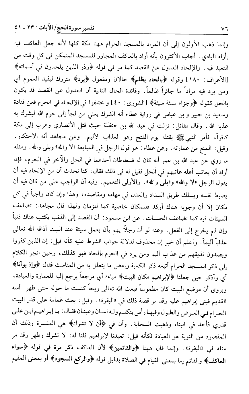 وإنما ذهب الأولون إلى أن المراد بالمسجد الحرام هاهنا مكة كلها لأنه جعل العاكف فيه بأزاء البادي. أجاب الأكثرون بأنه أراد بالعاكف المجاور للمسجد المتمكن في كل وقت من التعبد فيه. والإلحاد العدول عن القصد كما مر في قوله وَذَرُوا الَّذِينَ يُلْحِدُونَ فِي أَسْمائِهِ [الأعراف: 180] وقوله بِإِلْحادٍ بِظُلْمٍ حالان ومفعول يُرِدْ متروك ليفيد العموم أي ومن يرد فيه مرادا ما جائرا ظالما. وفائدة الحال الثانية أن العدول عن القصد قد يكون بالحق كقوله وَجَزاءُ سَيِّئَةٍ سَيِّئَةٌ [الشورى: 40] واختلفوا في الإلحاد في الحرم فعن قتادة وسعيد بن جبير وابن عباس في رواية عطاء أنه الشرك يعني من لجأ إلى حرم الله ليشرك به عذبه الله.