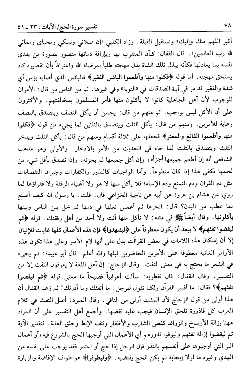 قوله ثُمَّ لْيَقْضُوا تَفَثَهُمْ لا يبعد أن يكون معطوفا على لِيَشْهَدُوا فإن هذه الأعمال كلها غايات للإتيان إلا أن إسكان هذه اللامات في بعض القراآت يدل على أنها لام الأمر وعلى هذا تكون هذه الأوامر الغائبة معطوفة على الأمرين الحاضرين قبلها والله أعلم. قال أبو عبيدة: لم يجيء في الشعر ما يحتج به في معنى التفث. وقال الزجاج: إن أهل اللغة لا يعرفون التفث إلا من التفسير. وقال القفال: قال نفطويه: سألت أعرابيا فصيحا ما معنى قوله ثُمَّ لْيَقْضُوا تَفَثَهُمْ؟ فقال: ما أفسر القرآن ولكنا نقول للرجل: ما أتفثك وما أدرنك! ثم زعم القفال أن هذا أولى من قول الزجاج لأن المثبت أولى من النافي. وقال المبرد: أصل التفث في كلام العرب كل قاذورة تلحق الإنسان فيجب عليه نقضها. وأجمع أهل التفسير على أن المراد هاهنا إزالة الأوساخ والزوائد كقص الشارب والأظفار ونتف الإبط وحلق العانة. فتقدير الآية ثم ليقضوا إزالة تفثهم وليوفوا نذورهم أي الأعمال التي أوجبها الحج بالشروع فيه، أو أعمال البر التي أوجبوها على أنفسهم بالنذر فإن الرجل إذا حج أو اعتمر فقد يوجب على نفسه من الهدي وغيره ما لولا إيجابه لم يكن الحج يقتضيه. وَلْيَطَّوَّفُوا هو طواف الإفاضة والزيارة