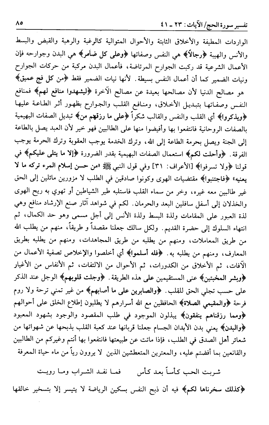 الواردات المطيفة والأخلاق الثابتة والأحوال المتوالية كالرغبة والرهبة والقبض والبسط والأنس والهيبة رِجالًا هي النفس وصفاتها وَعَلى كُلِّ ضامِرٍ هي البدن وجوارحه فإن الأعمال الشرعية قد ركبت الجوارح المرتاضة، فأعمال البدن مركبة من حركات الجوارح ونيات الضمير كما أن أعمال النفس بسيطة. لأنها نيات الضمير فقط مِنْ كُلِّ فَجٍّ عَمِيقٍ هو مصالح الدنيا لأن مصالحها بعيدة عن مصالح الآخرة لِيَشْهَدُوا مَنافِعَ لَهُمْ فمنافع النفس وصفاتها بتبديل الأخلاق، ومنافع القلب والجوارح بظهور أثر الطاعة عليها وَيَذْكُرُوا أي القلب والنفس والقالب شكرا عَلى ما رَزَقَهُمْ مِنْ تبديل الصفات البهيمية بالصفات الروحانية فانتفعوا بها وأفيضوا منها على الطالبين فهو خير لأن العبد يصل بالطاعة إلى الجنة ويصل بحرمة الطاعة إلى الله، وترك الخدمة يوجب العقوبة وترك الحرمة يوجب الفرقة. وَأُحِلَّتْ لَكُمُ استعمال الصفات البهيمية بقدر الضرورة إِلَّا ما يُتْلى عَلَيْكُمْ في قولنا وَلا تُسْرِفُوا [الأعراف: 31]