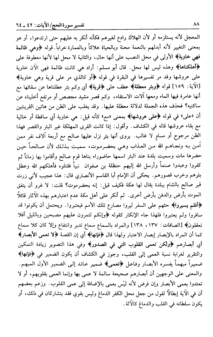 المعجل لأنه يستلزمه أو لأن الهلاك رادع لغيرهم فكأنه أنكر به عليهم حتى ارتدعوا، أو هو بمعنى التغيير لأنه أبدلهم بالنعمة محنة وبالحياة هلاكا وبالعمارة خرابا. قوله وَهِيَ ظالِمَةٌ فَهِيَ خاوِيَةٌ الأولى في محل النصب على أنها حال، والثانية لا محل لها لأنها معطوفة على أَهْلَكْناها وهذه ليس لها محل. قال أبو مسلم: أراد هي كانت ظالمة فهي الآن خاوية على عروشها وقد مر تفسيرها في البقرة في قوله أَوْ كَالَّذِي مَرَّ عَلى قَرْيَةٍ وَهِيَ خاوِيَةٌ [الآية: 159] قوله وَبِئْرٍ مُعَطَّلَةٍ عطف على قَرْيَةٍ أي وكم بئر عطلناها عن سقائها مع أنها عامرة فيها الماء ومعها آلات الاستقاء، وكم قصر مشيد مجصص أو مرتفع أخليناه عن ساكنيه؟ فحذف هذه الجملة لدلالة معطلة عليها. وقد يغلب على الظن من هاتين القرينتين أن «على» في قوله عَلى عُرُوشِها بمعنى «مع» كأنه قيل: هي خاوية أي ساقطة أو خالية مع بقاء عروشها قاله في الكشاف. وأقول: إذا كانت القرى المهلكة غير البئر والقصر فهذا الظن مرجوح أو مساو لا غالب. يروى أنها بئر نزل عليها صالح مع أربعة آلاف نفر ممن آمن به ونجاهم الله من العذاب وهي بحضرموت، سميت بذلك لأن صالحا حين حضرها مات وسميت بلدة عند البئر اسمها حاضوراء بناها قوم صالح وأقاموا بها زمانا ثم كفروا وعبدوا صنما وأرسل الله إليهم حنظلة بن صفوان نبيا فقتلوه فأهلكهم الله وعطل بئرهم وخرب قصورهم. يحكى أن الإمام أبا القاسم الأنصاري قال: هذا عجيب لأني زرت قبر صالح بالشام ببلدة يقال لها عكة فكيف قيل: إنه بحضرموت؟ قلت: لا غرو أن يتفق الموت بأرض والدفن بأرض أخرى. ثم أنكر على أهل مكة عدم اعتبارهم بهذه الآثار قائلا أَفَلَمْ يَسِيرُوا حثهم على السفر ليروا مصارع تلك الأمم فيعتبروا. ويحتمل أن يكونوا قد سافروا ولم يعتبروا فلهذا جاء الإنكار كقوله وَإِنَّكُمْ لَتَمُرُّونَ عَلَيْهِمْ مُصْبِحِينَ وَبِاللَّيْلِ أَفَلا تَعْقِلُونَ