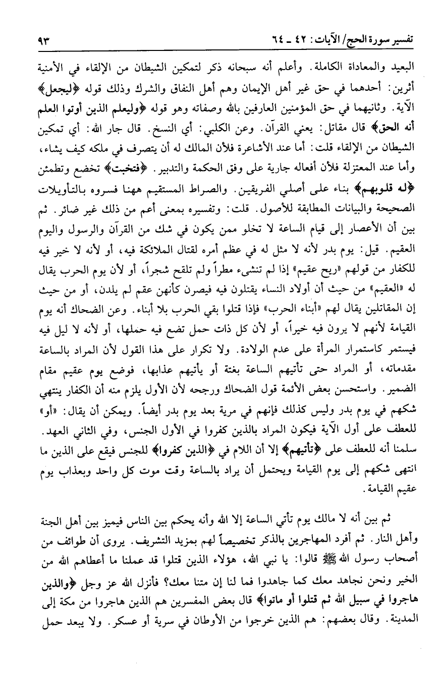 البعيد والمعاداة الكاملة. وأعلم أنه سبحانه ذكر لتمكين الشيطان من الإلقاء في الأمنية أثرين: أحدهما في حق غير أهل الإيمان وهم أهل النفاق والشرك وذلك قوله لِيَجْعَلَ الآية. وثانيهما في حق المؤمنين العارفين بالله وصفاته وهو قوله وَلِيَعْلَمَ الَّذِينَ أُوتُوا الْعِلْمَ أَنَّهُ الْحَقُّ قال مقاتل: يعني القرآن. وعن الكلبي: أي النسخ. قال جار الله: أي تمكين الشيطان من الإلقاء قلت: أما عند الأشاعرة فلأن المالك له أن يتصرف في ملكه كيف يشاء، وأما عند المعتزلة فلأن أفعاله جارية على وفق الحكمة والتدبير. فَتُخْبِتَ تخضع وتطمئن لَهُ قُلُوبُهُمْ بناء على أصلي الفريقين. والصراط المستقيم هاهنا فسروه بالتأويلات الصحيحة والبيانات المطابقة للأصول. قلت: وتفسيره بمعنى أعم من ذلك غير ضائر. ثم بين أن الأعصار إلى قيام الساعة لا تخلو ممن يكون في شك من القرآن والرسول واليوم العقيم. قيل: يوم بدر لأنه لا مثل له في عظم أمره لقتال الملائكة فيه، أو لأنه لا خير فيه للكفار من قولهم «ريح عقيم» إذا لم تنشئ مطرا ولم تلقح شجرا، أو لأن يوم الحرب يقال له «العقيم» من حيث أن أولاد النساء يقتلون فيه فيصرن كأنهن عقم لم يلدن، أو من حيث إن المقاتلين يقال لهم «أبناء الحرب» فإذا قتلوا بقي الحرب بلا أبناء. وعن الضحاك أنه يوم القيامة لأنهم لا يرون فيه خيرا، أو لأن كل ذات حمل تضع فيه حملها، أو لأنه لا ليل فيه فيستمر كاستمرار المرأة على عدم الولادة. ولا تكرار على هذا القول لأن المراد بالساعة مقدماته، أو المراد حتى تأتيهم الساعة بغتة أو يأتيهم عذابها، فوضع يوم عقيم مقام الضمير. واستحسن بعض الأئمة قول الضحاك ورجحه لأن الأول يلزم منه أن الكفار ينتهي شكهم في يوم بدر وليس كذلك فإنهم في مرية بعد يوم بدر أيضا. ويمكن أن يقال: «أو» للعطف على أول الآية فيكون المراد بالذين كفروا في الأول الجنس، وفي الثاني العهد.