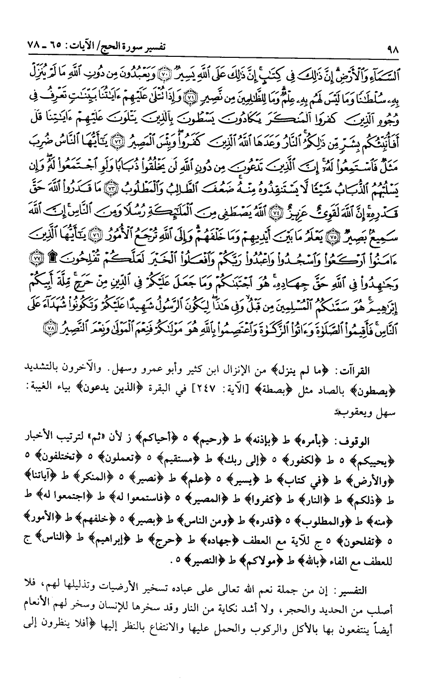بِأَمْرِهِ ط بِإِذْنِهِ ط رَحِيمٌ هـ أَحْياكُمْ ز لأن «ثم» لترتيب الأخبار يُحْيِيكُمْ هـ ط لَكَفُورٌ هـ إِلى رَبِّكَ ط مُسْتَقِيمٍ هـ تَعْمَلُونَ هـ تَخْتَلِفُونَ هـ وَالْأَرْضِ ط فِي كِتابٍ ط يَسِيرٌ هـ عِلْمٌ ط نَصِيرٍ هـ الْمُنْكَرَ ط آياتُنا ط ذلِكُمُ ط النَّارُ ط كَفَرُوا ط الْمَصِيرُ هـ فَاسْتَمِعُوا لَهُ ط اجْتَمَعُوا لَهُ ط مِنْهُ ط وَالْمَطْلُوبُ هـ قَدْرِهِ ط وَمِنَ النَّاسِ ط بَصِيرٌ هـ خَلْفَهُمْ ط الْأُمُورُ هـ تُفْلِحُونَ هـ ج للآية مع العطف جِهادِهِ ط حَرَجٍ ط إِبْراهِيمَ ط النَّاسِ ج للعطف مع الفاء بِاللَّهِ ط مَوْلاكُمْ ط النَّصِيرُ هـ.