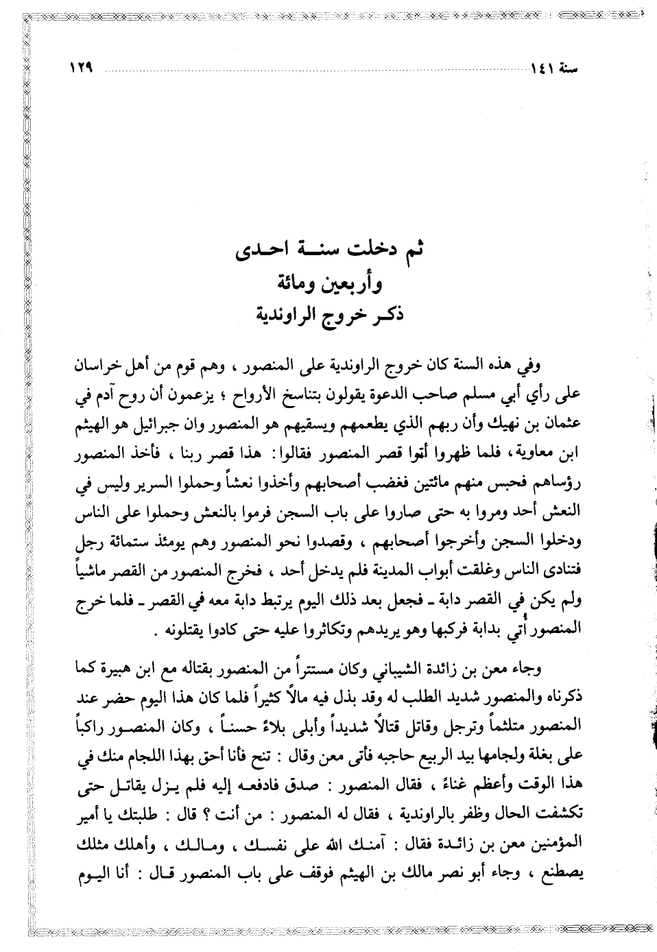 وفي هذه السنة كان خروج الراوندية على المنصور وهم قوم من أهل خراسان على رأي أبي مسلم صاحب الدعوة يقولون بتناسخ الارواح يزعمون انروح آدم في عثمان بن نهيك وان ربهم الذي يطعمهم ويسقيهم هو المنصور وان جبرائيل هو الهيثم ابن معاوية فلما ظهروا اتوا قصر المنصور فقالوا هذا قصر ربنا فأخذ المنصور رؤساهم فحبس منهم مائتين فغضب اصحابهم واخذوا نعشا وحملوا السرير وليس في النعش احدا ومروا به حتى صاروا على باب السجن فرموا بالنعش وحملوا على الناس ودخلوا السجن وأخرجوا أصحابهم وقصدوا نحو المنصور وهم يومئذ ستمائة رجل فتنادى الناس وغلقت ابواب المدينة فلم يدخل أحد فخرج المنصور من القصر ماشيا ولم يكن في القصر دابة فجعل بعد ذلك اليوم يرتبط دابة معه في القصر فلما خرج المنصور اتي بدابة فركبها وهو يريدهم وتكاثروا عليه حتى كادوا يقتلونه
