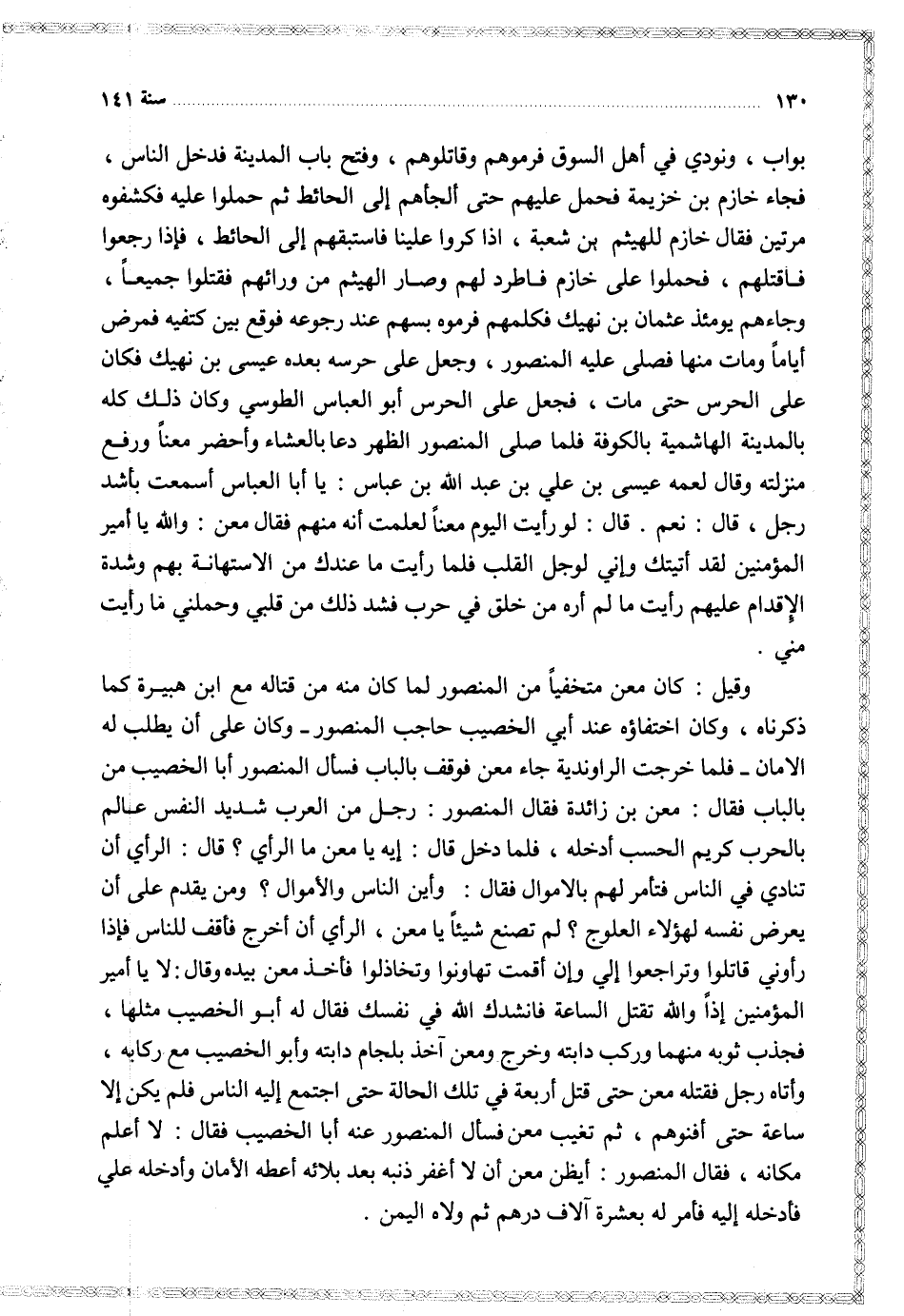 بواب ونودي في أهل السوق فرموهم وقاتلوهم وفتح باب المدينة فدخل الناس فجاء خازم بن خزيمة فحمل عليهم حتى الجاهم إلى الحائط ثم حملوا عليه فكشفوه مرتين فقال خازم للهيثم بن شعبة إذا كروا علينا فاستبقهم إلى الحائط فاذا رجعوا فاقتلهم فحملوا على خازم فاطرد لهم وصار الهيثم من ورائهم فقتلوا جميعا وجاءهم يومئذ عثمان بن نهيك فكلمهم فرموه بسهم عند رجوعه فوقع بين كتفيه فمرض اياما ومات منها فصلى عليه المنصور وجعلى على حرسه بعده عيسى بن نهيك فكان على الحرس حتى مات فجعل على الحرس أبو العباس الطوسي وكان ذلك كله بالمدينة الهاشمية بالكوفة فلما صلى المنصور الظهر دعا بالعشاء واحضر معنا ورفع منزلته وقال لعمه عيسى بن علي بن عبد الله بن عباس يا أبا العباس اسمعت بأشد رجل قال نعم