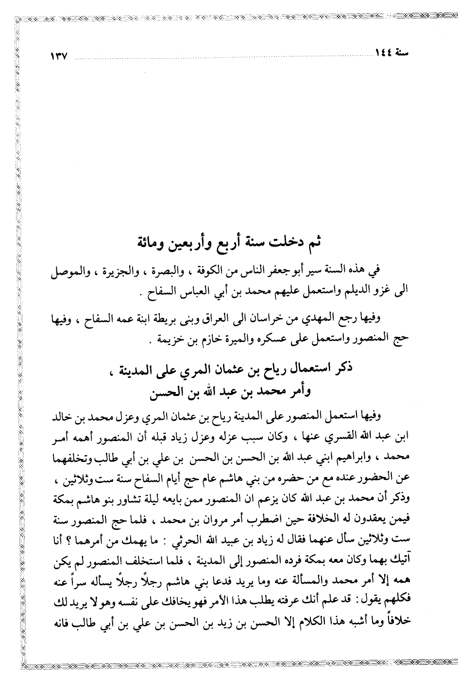 وفيها استعم المنصور على المدينة رياح بن عثمان المري وعزل محمد بن خالد ابن عبد الله القسري عنها وكان سبب عزله وعزل زياد قبله ان المنصور اهمه أمر محمد وابراهيم ابني عبد الله بن الحسن بن الحسن بن علي بن أبي طالب وتخلفهما عن الحضور عنده مع من حضره من بني هاشم عاك حج أيام السفاح سنة ست وثلاثين وذكر ان محمد بن عبد الله كان يزعم ان المنصور ممن بايعه ليلة تشاور بنو هاشم بمكة فيمن يعقدون له الخلافة حين اضطرب أمر مروان بن محمد فلما الحسن بن سهل المنصور سنة ست وثلاثين سأل عنهما فقال له زياد بن عبيد الله الحرثي ما يهمك من امرهما أنا آتيك بهما وكان معه بمكة فرده المنصور إلى المدينة فلما استخلف المنصور لم يكن همه الا أمر محمد والمسألة عنه وما يريد فدعا بني هاشم رجلا رجلا يساله سرا عنه فكلهم يقول قد علم أنك عرفته يطلب هذا الأمر فهو يخافك على نفسه وهو لا يريد لك خلافا وما شابه هذا الكلام الا الحسن بن زيد بن الحسن بن علي بن أبي طالب فانه