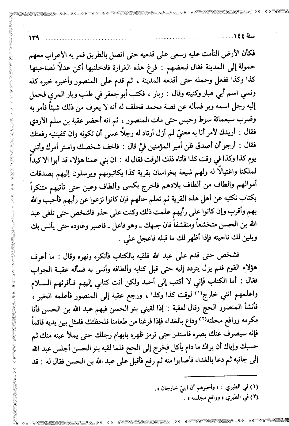 فشخص حتى قدم على عبد الله فلقيه بالكتاب فانكره ونهره وقال ما ارعف هؤلاء القوم فلم يزل يتردد إليه حتى قبل كتابه والطافه وانس به فساله عقبة الجواب فقال اما الكتاب فاني لا اكتب إلى أحد ولكن أنت كتابي إليهم فاقرئهم السلام واعلمهم انني خارج لوقت كذا وكذا ورجع عقبة إلى المنصور فاعلمه الخبر فاشنا المنصور الحج وقال لعقبة إذا لقيني بنو الحسن فيهم عبد الله بن الحسن فأنا مكرمه ورافع محلته وداع بالغداء فاذا فرغنا من طعامنا فلحظتك فامثل بين يديه قائما فانه سيصرف عنك بصره فاستدر حتى ترمز ظهره بابهام رجلك حتى يملأا عينه منك ثم حسبك واياك ان يراك ما دام ياكل فخرج إلى الحج فلما لقيه بنو الحسن اجلس عبد الله إلى جانبه ثم دعا بالغداء فاصابوا منه ثم رفع فاقبل على عبد الله بن الحسن فقال له قد