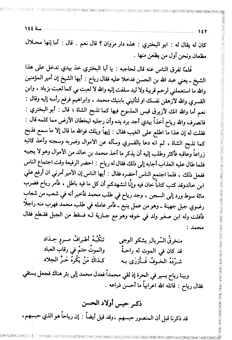 فلما تفرق الناس عنه قال لحاجبه يا أبا البختري خذ بيدي ندخل على هذا الشيخ يعني عبد الله بن الحسن فدخلا عليه فقال رياح ايها الشيخ ان أمير المؤمنين والله ما استعملني لرححم قريبة ولا ليد سلفت إليه والله لا لعبت بي كما لعبت بزيا د وابن القسري والله لازهقن نفسك أو لتأتيني بابنيك محمد وابراهيم فرفع راسه إليه وقال نعم اما والله انك لأزيرق قيس المذبوح فيها كما تذبح الشاة قال أبو البختري فانضرق والله رياح آخذا بيدي أجد برد يده وان رحليه ليخطان الأرض مما كلمه قال فقلت له ان هذا ما اطلع على الغيب فقال إيها ويلك فوالله ما قال الا ما سمع فذبح كما تذبح الشاة ثم انه دعا بالقسري وساله عن الأموال وضربه وسجنه وأخذ كاتبه زراعا وعاقبه فاكثر وطلب إليه ان يذكر ما أخذ محمد بن خالد من الأموال وهو لا يجيبه فلما طال عليه العذاب أجابه إلى ذلك فقال له رياح احضر الرفيعة وقت اجتماع الناس ففل ذلك فلما اجتمع الناس احضره فقال ايها الناس ان الامير امرني ان ارفع علي ابن خالد وقد كتب كتأبا خان فيه وانا لنشهدكم ان كل ما فيه باطل فأمر رياح فضرب مائة سوط ورد إلى السجن وجد رياح في طلب محمد فاخبر انه في شعب من شعاب رضوي جبل جهينة وهو من عمل ينبع فأمر عامله في طلب محمد فهرب منه راجلا فافلت وله ابن صغير ولد في خوفه وهو مع جارية له فسقط من الجبل فقطع فقال محمد