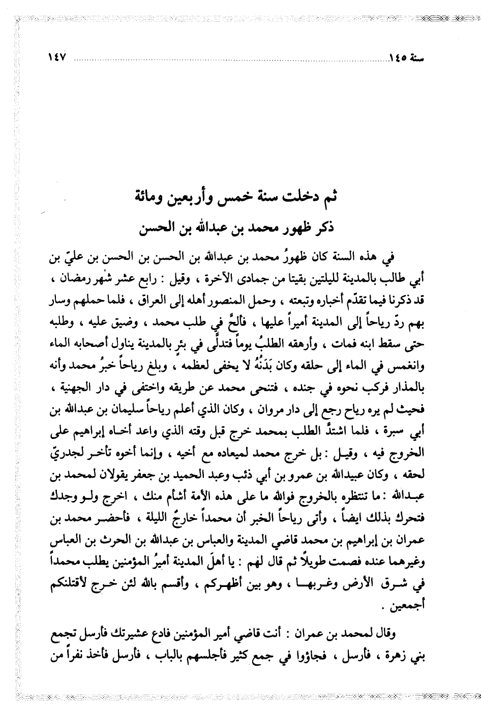 في هذه السنة كان ظهور محمد بن عبد الله بن الحسن بن الحسن بن علي بن أبي طالب بالمدينة لليلتين بقيتا من جمادى الآخرة وقيل رابع عشر شهر رمضان قد ذكرنا فيما تقدم أخباره وتبعته وحمل المنصور أهله إلى العراق فلما حملهم وسار بهم رد رياحا إلى المدينة اكيرا عليها فالح في طلب محمد وضيق عليه وطلبه حتى سقط ابنه فمات وارهقه الطلب يوما فتدلى في بئر بالمدينة يناول أصحابه الماء وانغمس في الماء إلى حلقه وكان بدنه لا يخفى لعظمه وبلغ رياحا خبر محمد وانه بالمذار فركب نحوه في جنده فتنحى محمد عن طريقه واختفى في دار الجهينة فحيث لم يره رياح رجع إلى دار مروان وكان الذي اعلم رياحا سليمان بن عب د الله بن أبي سبرة فلما اشتد الطلب بمحمد خرج قبل وقته الذي واعد اخاه إبراهيم على الخروج فيه وقيل بل خرج محمد لميعاده مع أخيه وإنما اخوه تاخر لجدري لحقه وكان عبيد الله بن عمرو بن أبي ذئب وعبد الحميد بن جعفر يقولان لمحمد بن عبد الله ما تنتظره بالخروج فوالله ما على هذه الامة أشام منك اخرج ولو وجدك فتحرك بذلك أيضا واتى رياحا الخبر ان محمدا خارجد الليلة فاحضر دمحمد بن عمران بن إبراهيم بن محمد قاضي المدينة والعباس بن عبد الله بن الحرث بن العباس وغيرهما عنده فصمت طويلا ثم قال لهم يا أهل المدينة أمير المؤمنين يطلب محمدا في شرق الأرض وغربها وهو بين اظهركم واقسم بالله لئن خرج لاقتلنكم اجميعن