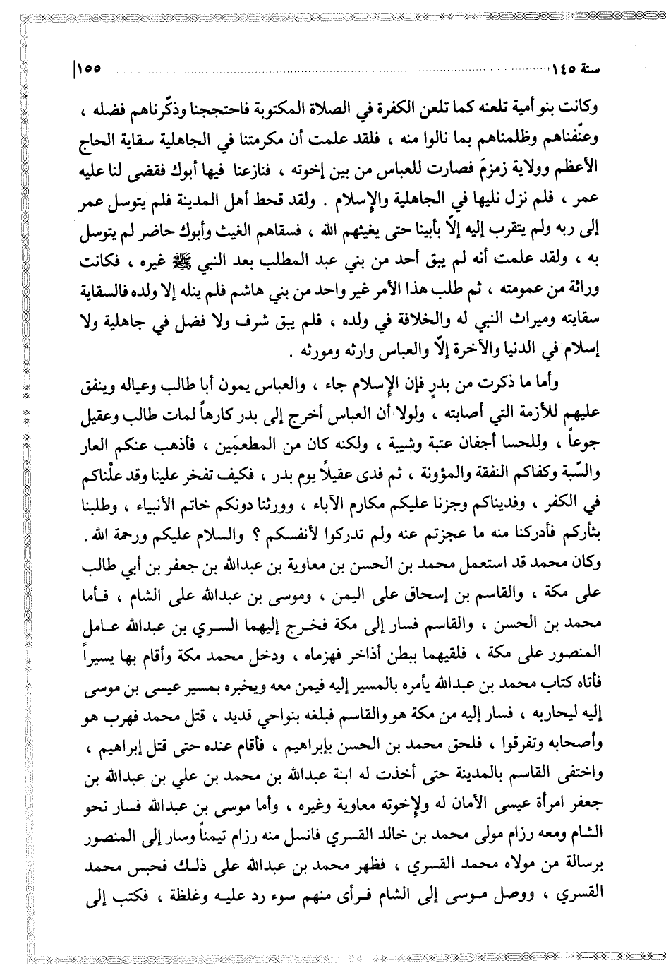 وأما ما ذكرت من بدر فإن الإسلام جاء والعباس يمون أبا طالب وعياله وينفق عليهم للأزمة التي أصابته ولولا أن العباس أخرج إلى بدر كارها لمات طالب وعقيل جوعا وللحسا أجفانه عتبة وشيبة ولكنه كان من المطعمين فأذهب عنكم العار والسبة وكفاكم النفقة والمؤونة ثم فدى عقيلا يود بدر فكيف تفخر علينا وقد علناكم في الكفر وفديناكم وجزنا عليكم مكارم الأباء ورثنا دونكم خاتم الأنبياء وطلبنا بثأركم فأدركنا منه ما عجزتم عنه ولم تدركوا لأنفسكم والسلام عليكم ورحمة الله