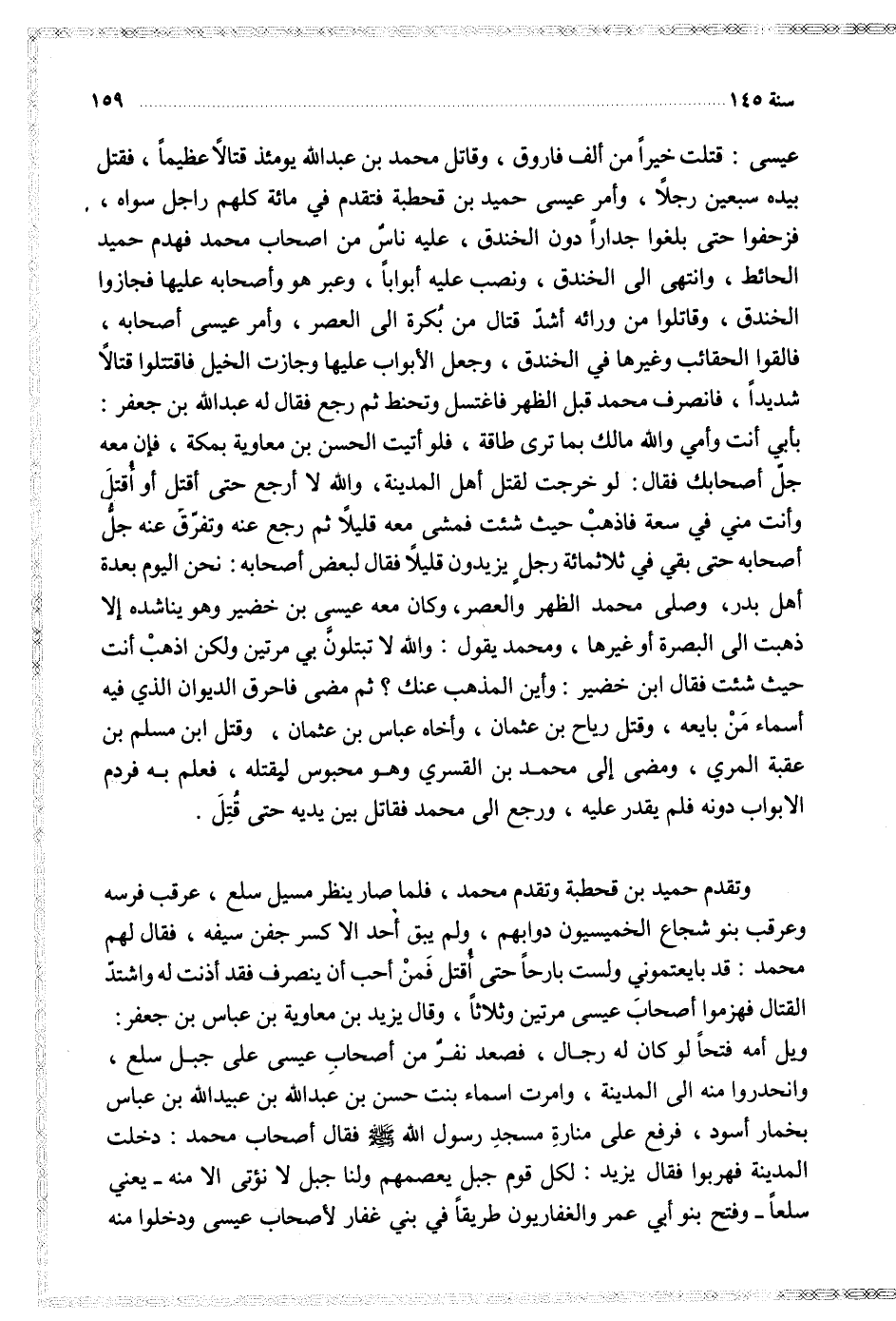 عيسى قتلت خيرا من ألف فاروق وقاتل محمد بن عبد الله يومئذ قتالا عظيما فقتل بيده سبعين رجلا وأمر عيسى حميد بن قحطبة فتقدم في مائة كلهم راجل سواه فزحفوا حتى بلغوا جدارا دون الخندق عليه ناس من أصحاب محمد فهدم حميد الحائط وأنتهى إلى الخندق ونصب عليه أبوأبا وعبر هو وأصحابه عليها فجازوا الخندق وقاتلوا من ورائه أشد قتال من بكرة إلى العصر وأمر عيسى أصحابه فالقوا الحقائب وغيرها في الخندق وجعل الأبواب عليها وجازت الخيل فاقتتلوا قتالا شديدا فانصرف محمد قبل الظهر فاغتسل وتحنط ثم رجع فقال له عبد الله بن جعفر بأبي أنت وأمي والله مالك بما ترى طاقة فلو أتيت الحسن بن معاوية بمكة فإن معه جل أصحابك فقال لو خرجت لقتل أهل المدينة والله لا أرجع حتى أقتل أو أقتل وأنت مني في سعة فاذهب حين شئت فمشى معه قليلا ثم رجع عنه وتفرق عنه جل أصحابه حتى بقي في ثلاثمائة رجل يزيدون قيلال فقال لبعض أصحابه نحن اليوم بعدة أهل بدر وصلى محمد الظهر والعصر وكان معه عيسى بن خضير وهو يناشده إلا ذهبت إلى البصرة أو غيرها ومحمد يقول والله لا تبتلون بي مرتين ولكن اذهب أنت حيث شئت فقال ابن خضير وأين المذهب عنك ثم مضى فاحرق الديوان الذي فيه أسماء من بايعه وقتل رياح بن عثمان وأخاه عباس بن عثمان وقتل ابن مسلم بن عقبة المري ومضى إلى محمد بن القسري وهو محبوس ليقتله فعلم به فردم الابواب دونه فلم يقدر عليه ورجع إلى محمد فقاتل بين يديه حتى قتل