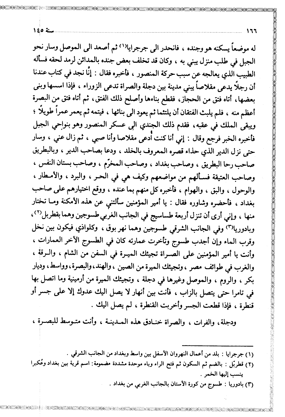 له موضعا يسكنه هو وجنده فانحدر إلى جرجرايا ثم أصعد إلى الموصل وسار نحو الجبل في طلب منزل يبنى له وكان قد تخلف بعض جنده بالمدائن لرمد لحقه فساله الطبيب الذي يعالجه عن سبب حركة المنصور فأخبره فقال أنا نجد في كتاب عندنا أن رجلا يدعى مقلاصا يبنى مدينة بين دجلة والصراة تدعى الزوراء فإذا اسسها وبنى بعضها أتاه فتق من الحجاز فقطع بناءها وأصلح ذلك الفتق ثم أتاه فتق من البصرة أعظم منه فلم يلبث الفتقان أن ليتئما ثم يعود إلى بنائها فيتمه ثم يعمر عمرا طويلا ويبقى الملك في عقبه فقدم ذلك الجندي إلى عسكر المنصور وهو بنواحي الجبل فأخبره الخبر فرجع وقال إني أنا كنت أدعي مقلاصا وأنا صبي ثم زال عني وسار حتى نزل الدير الذي حذاء تقصره المعروف بالخلد ودعا بصاحب الدير وبالبطريق صاحب رحا البطريق وصاحب بغداد وصاحب المخرم وصاحب بستان النفس وصاحب العتيقة فسالهم عن مواضعهم وكيف هي في الحر والبرد والأمطار والوحول والبق والهوام فأخبره كل منهم بما عنده ووقع اختيارهم على صاحب بغداد فأحضره وشاوره فقال يا أمير المؤمنين سألتني عن هذه الأمكنة وما نختار منها وإني أرى أن تنزل أربعة طساسيج في الجانب الغرب طسوجين وهما بقطربل وبادوريا وفي الجانب الشرقي طسوجين وهما نهر بوق وكلواذي فيكون بين نخل وقرب الماء وإن أجدب طسوج وتأخرت عمارته كان في الطسوج الآخر العمارات وأنت يا أمير المؤمنين على الصراة تجيئك الميرة في السفن من الشام والرقة والغرب في طوائف مصر وتجيئك الميرة من الصين والهند والصرة وواسط وديار بكر والروم والموصل وغيرها في دجلة وتجيئك الميرة من أرمينية وما اتصل بها في تامرا حتى يتصل بالزاب فأنت بين أنهار لا يصل إليك عدوك إلا على جسر أو قنطرة فإذا قطعت الجسر وأخربت القنطرة لم يصل إليك