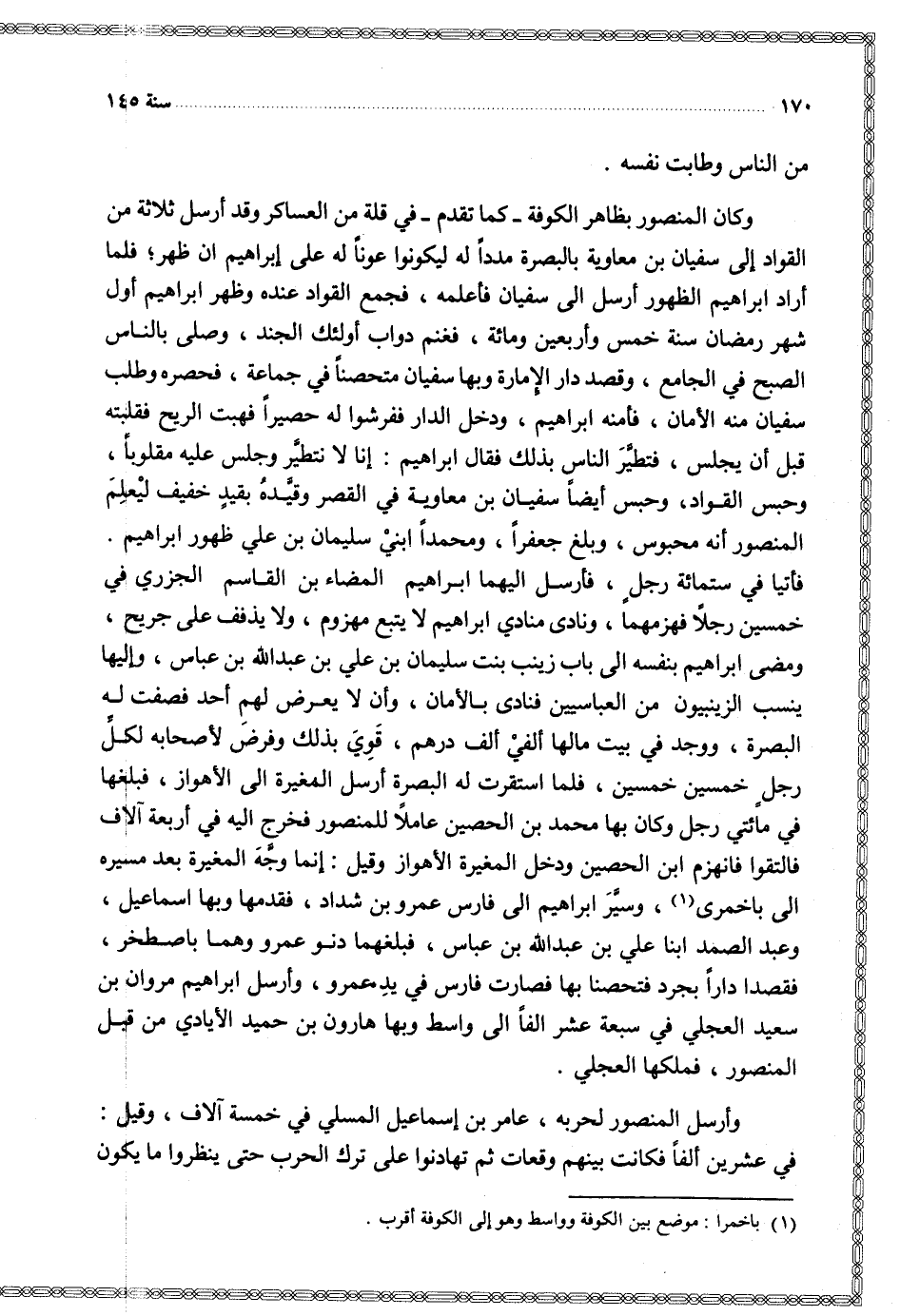 فأتيا في ستائة رجل فأرسل إليهما إبراهيم المضاء بن القاسم الجزري في خمسين رجلا فهزمهما ونادى مناي إبراهيم لا يتبع مهزوم ولا يذفف على جريح ومضى إبراهيم بنفسه إلى باب زينب بنت سليمان بن علي بن عبد الله بن عباس وإليها ينسب الوينبيون من العباسيين فنادى بالأمان وأن لا يعرض لهم أحد فصفت له البصرة ووجد في بيت مالها ألفي ألف درهم قوي بذلك وفرض لأصحابه لكل رجل خمسين خمسين فلما استقرت له البصرة أرسل المغيرة إلى الأهواز فبلغها في مئاتي رجل وكان بها محمد بن الحصين عاملا للمنصور فخرج إليه في أربعة آلاف فالتقوا فانهزم ابن الحصين ودخل المغيرة الأهواز وقيل إنما وجه المغيرة بعد مسيره إلى باخمرى وسير إبراهيم إلى فارس عمرو بن شداد فقدمها وبها إسماعيل وعبد الصمد ابنا علي بن عبد الله بن عباس فبلغهما دنو عمرو وهما باصطخر فقصد دارا بجرد فتحصنا بها فصارت فارس في يد عمرو وأرسل إبراهيم مروان بن سعيد العجلي في سبعة عشر ألفا إلى واسط وبها هارون بن حميد الأيادي من قبل المنصور فملكها العحلي