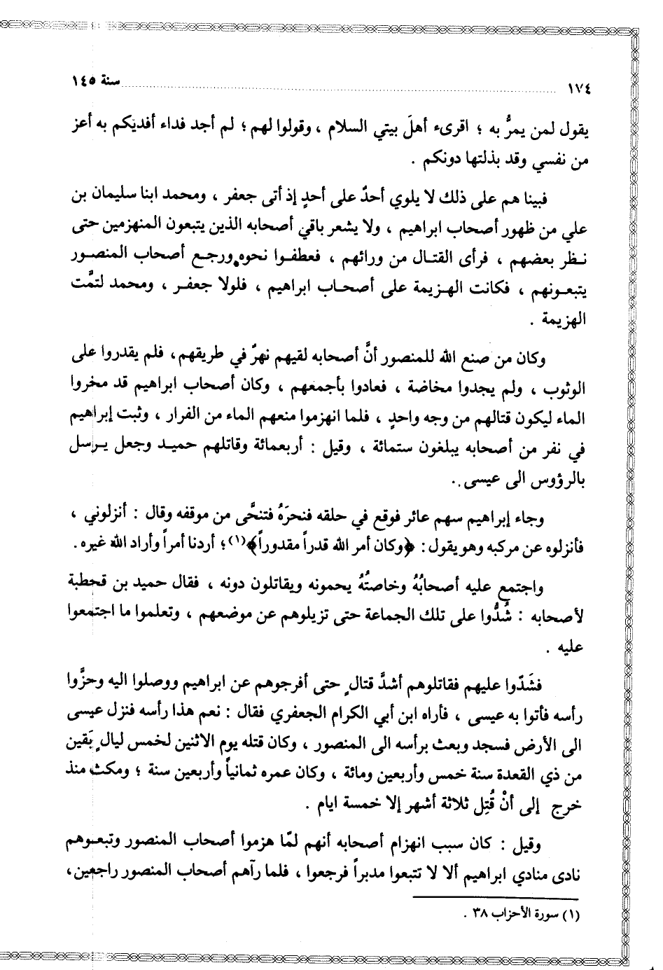 فشدوا عليهم فقاتلوهم أشد قتال حتى أفرجوهم عن إبراهيم ووصلوا إليه وحزوا رأسه فأتوا به عيسى فأراه ابن أبي الكرام الجعفري فقال نعم هذا رأسه فنزل عيسى إلى الأرض فسجد وبعث براسه إلى المنصور وكان قتله يوم الاثنين لخمس ليال بقين من ذي القعدة سنة خمس وأربعين ومائة وكان عمره ثمانيا وأربعين سنة ومكث منذ خرج إلى أن قتل ثلاثة أشهر إلا خمسة أيام
