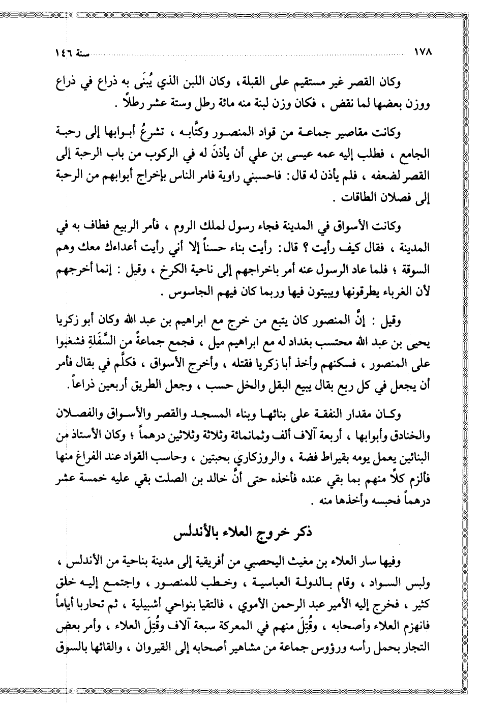 وفيها سار العلاء بن مغيث اليحصبي من أفريقية إلى مدينة بناحية من الأندلس ولبس السواد وقام بالدولة العباسية وخطب للمنصور واجتمع إليه خلق كثير فخرج إليه الأمير عبد الرحمن الأموي فالتقيا بنواحي أشبيلية ثم تحاربا أياما فانهزم العلاء وأصحابه وقتل منهم في المعركة سبعة آلاف وقتل العلاء وأمر بعض التجار بحمل رأسه ورؤوس جماعة من مشاهير أصحابه إلى القيروان والقائها بالسوق