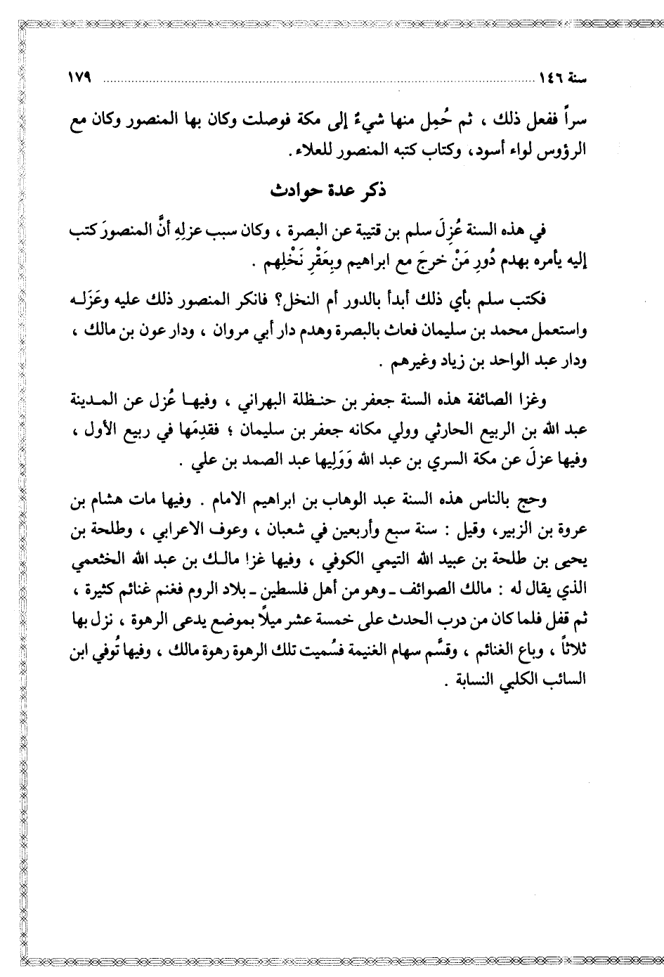 وغزا الصائفة هذه السنتة جعفر بن حنظلة البهراني وفيها عزل عن المدينة عبد الله بن الربيع الحارثي وول مكانه جعفر بن سليمان فقدمها في ربيع الأول وفيها عزل عن مكة السري بن عبد الله ووليها عبد الصمد بن علي