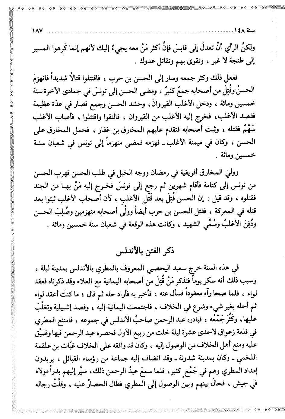 ففعل ذلك وكثر جمعه وسار إلى الحسن بن حرب فاقتتلوا قتالا شديدا فانهزم الحسن وقتل من أصحابه جمع كثير ومضى الحسن إلى تونس في جمادى الآخرة سنة خمسين ومائة ودخل الأغلب القيروان وحشد الحسن وجمع فصار في عدة عظيمة فقصد الأغلب فخرج إليه الاغلب من القيروان فالتقوا واقتتلوا فأصاب الأغلب سهم فقتله وثبت أصحابه فتقدم عليهم المخارق بن غفار فحمل المخارق على الحسن وكان في ميمنة الاغلب فهزمه فمضى منهزما إلى تونس في شعبان سنة خمسين ومائة