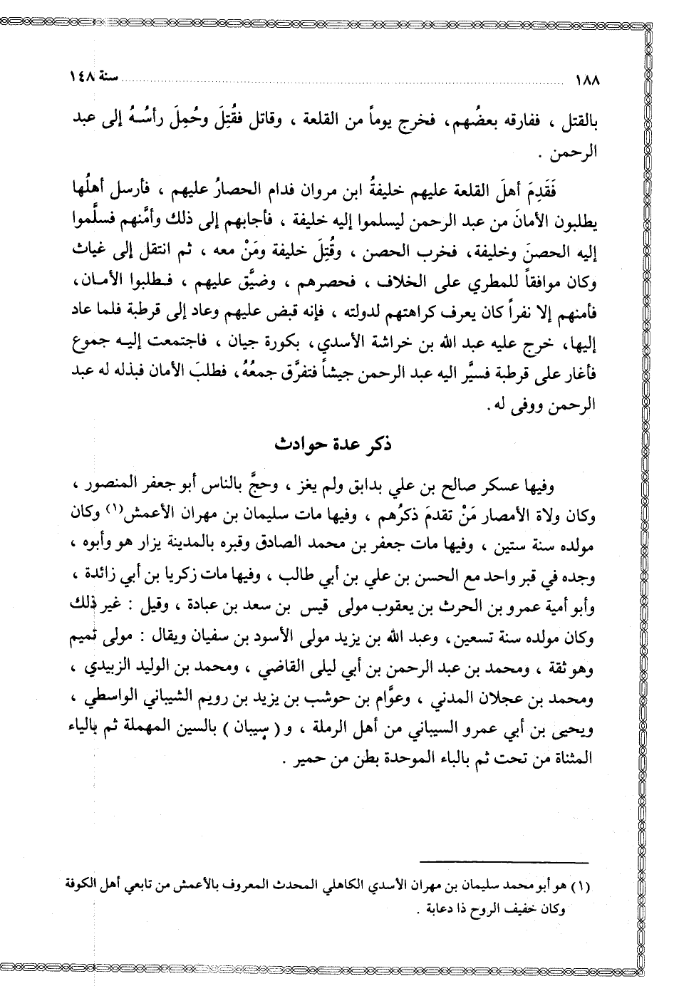وفيها عسكر صالح بن علي بدابق ولم يغز وحج بالناس أبو جعفر المنصور وكان ولاة الأمصار من تقدم ذكرهم وفيها مات سليمان بن مهران الأعمش وكان مولده سنة ستين وفيها مات جعفر بن محمد الصادق وقبره بالمدينة يزار هو وأبوه وجده في قبر واحد مع الحسن بن علي بن أبي طالب وفيها مات زكريا بن أبي زائدة وأبو أمية عمرو بن الحرث بن يعقوب مولى قيس بن سعد بن عبادة وقيل غير ذلك وكان مولده سنة تسعين وعبد الله بن يزيد مولى الأسود بن سفيان ويقال مولى تميم وهو ثقة ومحمد بن عبد الرحمن بن أبي ليلى القاضي ومحمد بن الوليد الزبيدي ومحمد بن عجلان المدني وعوام بن حوشب بن يزيد بن رويم الشيباني الواسطي ويحيى بن أبي عمرو السيباني من أهل الرملة و ( سيبان ) بالسين المهملة ثم بالياء المثناة من تحت ثم بالباء الموحدة بطن من حمير