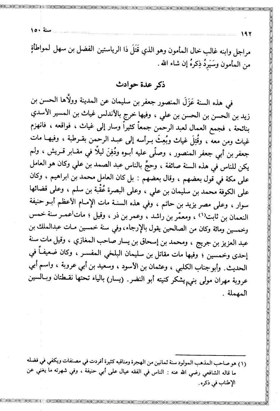 في هذه السنة عزل المنصور جعفر بن سليمان عن المدينة وولاها الحسن بن زيد بن الحسن بن الحسن بن علي وفيها خرج بالأندلس غياث بن المسير الأسدي بنائحة فجمع العمال لعبد الرحمن جمعا كثيرا وسار إلى غياث فواقعه فانهزم غياث ومن معه وقتل غياث وبعث برأسه إلى عبد الرحمن بقرطبة وفيها مات جعفر بن أبي جعفر المنصور وصلى عليه أبوه ودفن ليلا في مقابر قريش ولم يكن للناس في هذه السنة صائفة وحج بالناس عبد الصمد بن عل وكان هو العامل على مكة في قول بعضهم وقال بعضهم بل كان العامل محمد بن إبراهيم وكان على الكوفة محمد بن سليمان بن علي وعلى البصرة عقبة بن سلم وعلى قضائها سوار وعلى مصر يزيد بن حاتم وفي هذه السنة مات الإمام الأعظم أبو حنيفة النعمان بن ثابت ومعمر بن راشد وعمر بن ذر وقيل مات عمر سنة خمس وخمسين ومائة وكان من الصالحين يقول بالإرجاء وفي سنة خمسين مات عبد الملك بن عبد العزيز بن جريج ومحمد بن إسحاق بن يسار صاحب المغازي وقيل مات سنة إحدى وخمسين وفيها مات مقاتل بن سليمان البلخي المفسر وكان ضعيفا في الحديث