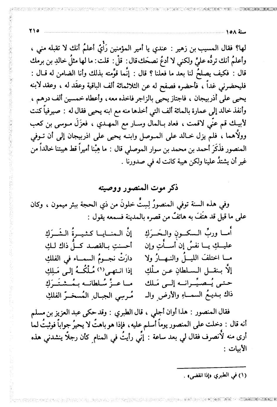 فقال المنصور هذا أوان أجلي قال الطبري وقد حكى عبد العزيز بن مسلم أنه قال دخلت على المنصور يوما أسلم عليه فإذا هو باهت لا يحير جوأبا فوثبت لما أرى منه لأنصرف فقال لي بعد ساعة إني رأيت في المنام كأن رجلا ينشدني هذه الأبيات