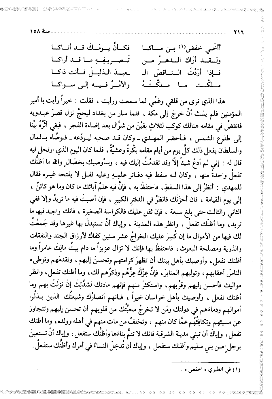 هذه الذي ترى من قلقي وغمي لما سمعت ورأيت فقلت خيرا رأيت يا أمير المؤمنين فلم يلبث أن خرج إلى مكة فلما سار من بغداد ليحج نزل قصر عبدويه فانقض في مقامه هناك كوكب لثالث بقين من شوال بعد إضاءة الفجر فبقي أثره بنا إلى طلوع الشمس فأحضر المهيد وكان قد صحبه ليوعدة فوصاه بالمال والسلطان يفعل ذلك كل يوم من أيام مقامه بكره وعشية فلما كان اليوم الذي ارتحل فيه قال له إني لم أده شيئا إلى قد تقدمت إليك فيه وسأوصيك بخصال والله ما أظنك تفعل واحدة منها وكان له سفط فيه دفاتر علمه وعليه قفل لا يفتتح غيره فقال للمهدي انظر إلى هذا السفط فاحتفظ به فإن فيه علم أبائك ما كان وما هو كائن إلى يوم القيامة فإن أحزنك فانظر في الدفتر الكبير فإن أصبت فيه ما تريد والا ففي الثاني والثالث حتى بلغ سبعة فإن ثقل عليك فالكراسة الصغيرة فإنك واجد فيها ما تريد وما أظنك تفعل وانظر هذه المدينة وإياك أن تستبدل بها غيرها وقد جمعت لك فيها الأموال ما أن كسر عليك الخراج عشر سنين كفاك لإرزاق الجندي والنفقات والذرية ومصلحة البعوث فاحتفظ بها فإنك لا تزال عزيزا ما دام بيت مالك عأمرا وما أظنك تفعل وأوصيك بأهل بيتك أن تظهر كرامتهم وتحسن إليهم وتقدمهم وتوطئ الناس أعقابهم وتوليهم المنابر فإن عزك عزوهم وذكرهم لك وما أظنك تفعل وانظر مواليك وأحسن إليهم وقربهم واستكثر منهم فإنهم مادتك لشدتك أن نزلت بهم وما أظنك تفعل وأوصيك بخراسان خيرا فانهم أنصارك وشيعتك الذين بذلوا أموالهم ودمائهم في دولتك ومن لا تخرج محبتك من قلوبهم فالتحسن إليهم وتتجاوز عن مسيئهم وتكافئهم عما كان منهم وتأوى وتخلف من مات منهم في أهله وولده وما أظنك تفعل وإياك أن تبني مدينة الشرقية فانك لا تتم بنائها وأظنك ستفعل وإياك أن تستعين برجل من بني سليم وأظن ستفعل وإياك أن تدخل النساء في أمرك وأظنك تفعل
