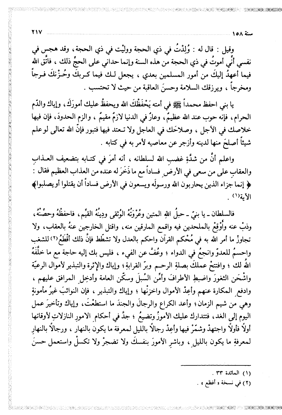 يا بني احفظ محمدا في أمته يحفظك الله ويحفظ عليك أمورك وإياك والدم الحرام فانه حوب عند الله عظيم وعار في الدنيا لازم مقيم والزم الحدود فان فيها خلاصك في الأجل وصلاحك في العاجل ولا تعتد فيها فتبور فان الله تعالى لو علم شيئا اصلح منها دينه وازجر عن معاصيه لأمر به في كتابه