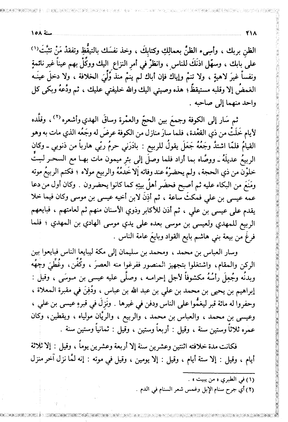 وسار العباس بن محمد ومحمد بن سليمان إلى مكة ليبايع الناس فبايعوا بين الركن والمقام واشتغلوا بتجهيز المنصور ففرغوا منه العصر وكفن وغطي وجهه وبدنه وجعل رأسه مكشوفا لأجل إحرامه وصلى عليه عيسى بن موسى وقيل إبراهيم بن يحيى بن محمد بن علي بن عبد الله بن العباس ودفن في مقبرة المعلاة وحفروا له مئة قبر ليغموا على الناس ودفن في غيرها ونزل في قبره عيسى بن علي وعيسى بن محمد والعباس بن محمد والربيع والريان مولياه ويقطين وكان عمره ثلاثا وستين سنة وقيل أربع وستين وقيل ثمانيا وستين سنة