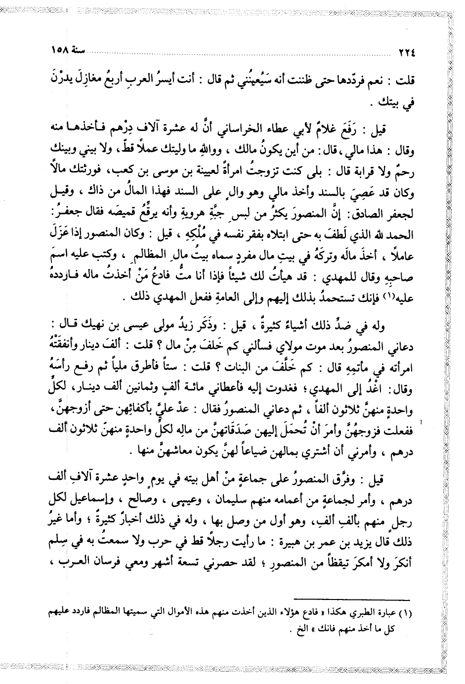 قيل رفع غلام لأبي عطاء الخراساني انه له عشرة آلاف درهم فأخذها منه وقال هذا مالي قال من أين يكون مالك ووالله ما وليتك عملا قط ولا بيني وبينك رحم ولا قرابة قال بلى كنت تزوجت أمرأة لعيينة بن موسى بن كعب فورثتك مالأ وكان قد عصى بالسند واخذ مالي وهو وال على السند فهذا المال من ذاك وقيل لجعفر الصادق أن المنصور يكثر من لبس جبو هروية وانه يرقع قميصه فقال جعفر الحمد لله الذي لطف به حتى ابتلاه بفقر نفسه في ملكه قيل وكان المنصور إذا عزل عاملا اخذ ماله وتركه في بيت مال مفرد سماه بيت مال المظالم وكتب عليه اسم صاحبه وقال للمهدي قد هيأت لك شيئا فإذا أنا مت فادع من أخذت ماله فاردده عليه فانك تستحمد بذلك إليهم والى العامة ففعل المهدي ذلك