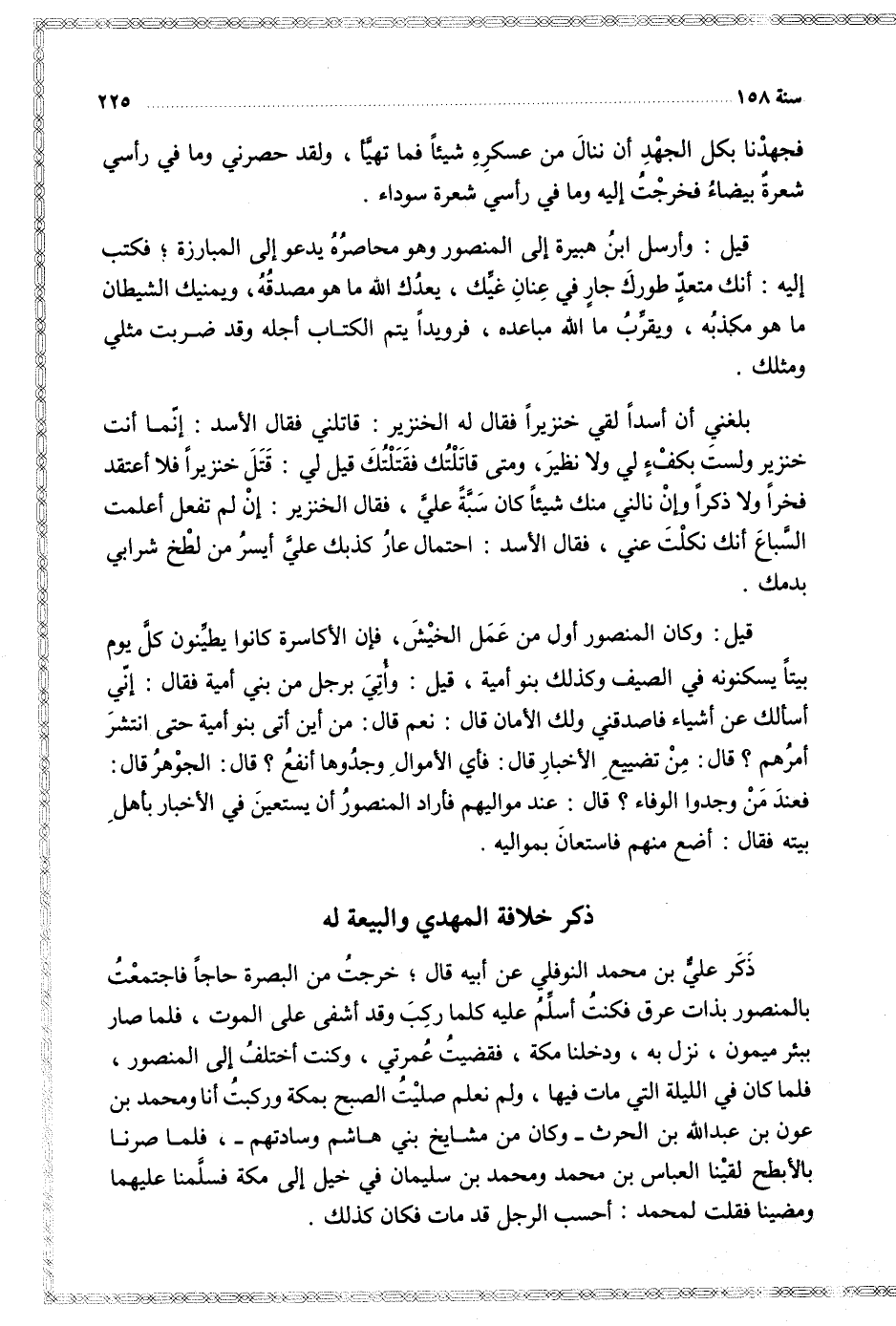 - ذكر علي بن محمد النوفلي عن أبيه قال خرجت من البصرة حاجا فاجتمعت بالمنصور بذات عرق فكنت اسلم عليه كلما ركب وقد أشفى على الموت فلما صار ببئر ميمون نزل به ودخلنا مكة فقضيت عمرتي وكنت اختلف إلى المنصور فلما كان في الليلة التي مات فيها ولم نعلم صليت الصبح بمكة وركبت أنا ومحمد بن عون بن عبد الله بن الحرث وكان من مشايخ بني هاشم وسادتهم فلما صرنا بالبطح لقينا العباس بن محمد ومحمد بن سليمان في خيل إلى مكة فسلمنا عليهما ومضينا فقلت لمحمد احسب الرجل قد مات فكان كذلك