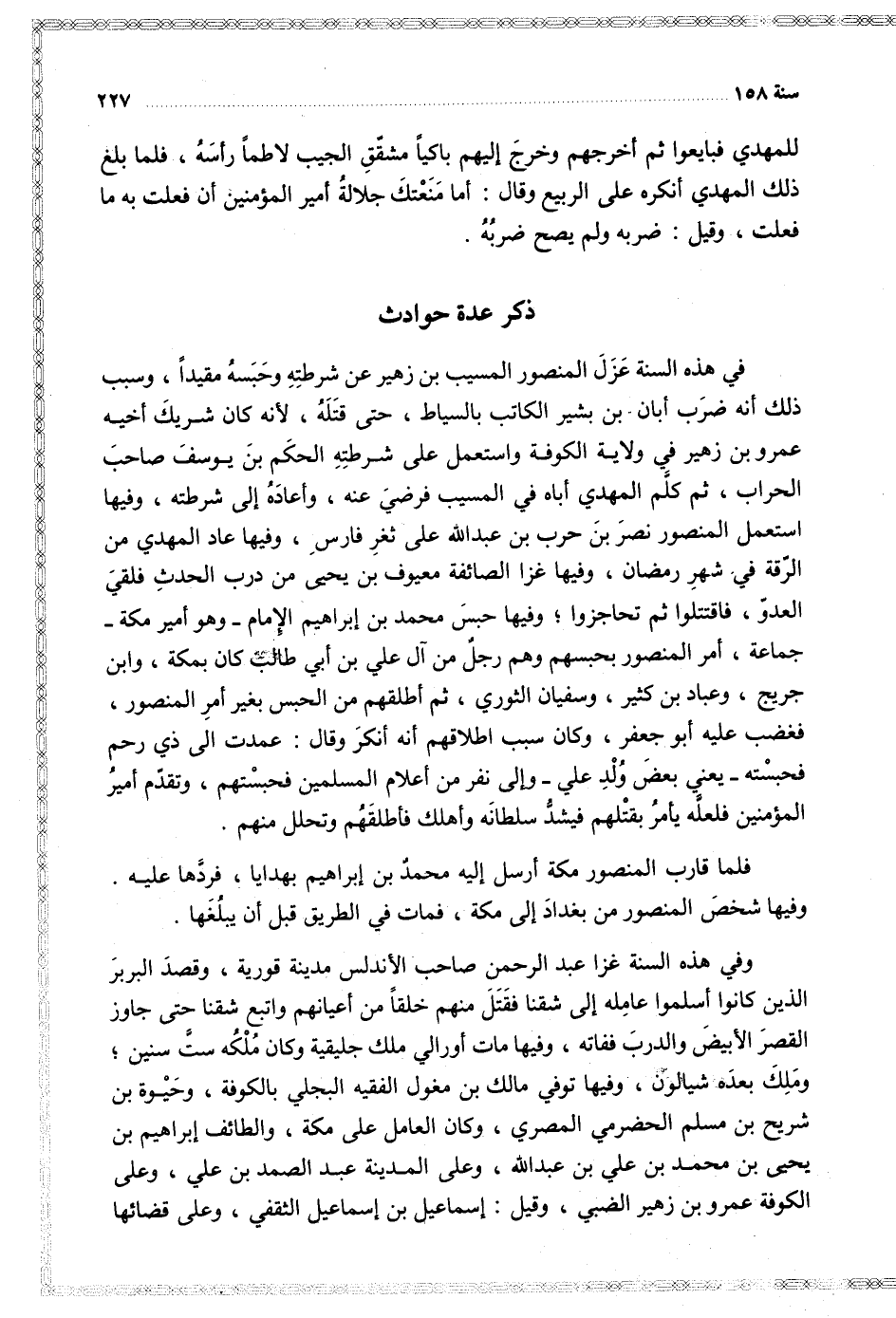 وفي هذه السنة غزا عبد الرحمن صاحب الأندلس مدينة قورية وقصد البربر الذين كانوا اسلموا عامله إلى شقنا فقتل منهم خلفا من أعيانهم واتبع شقنا حتى جاوز القصر الأبيض والدرب ففاته وفيها مات اورالي ملك جليقية وكان ملكه ست سنين وملك بعده شيالون وفيها توفي مالك بن مغول الفقيه البجلي بالكوفة وحيوة ين شريح بن مسلم الحضرمي المصري وكان العامل على مكة والطائف إبراهيم بن يحيى بن محمد بن علي بن عبد الله وعلى المدينة عبد الصمد بن علي وعلى الكوقة عمرو بن زهير الضبي وقيل إسماعيل بن إسماعيل الثقفي وعلى قضائها