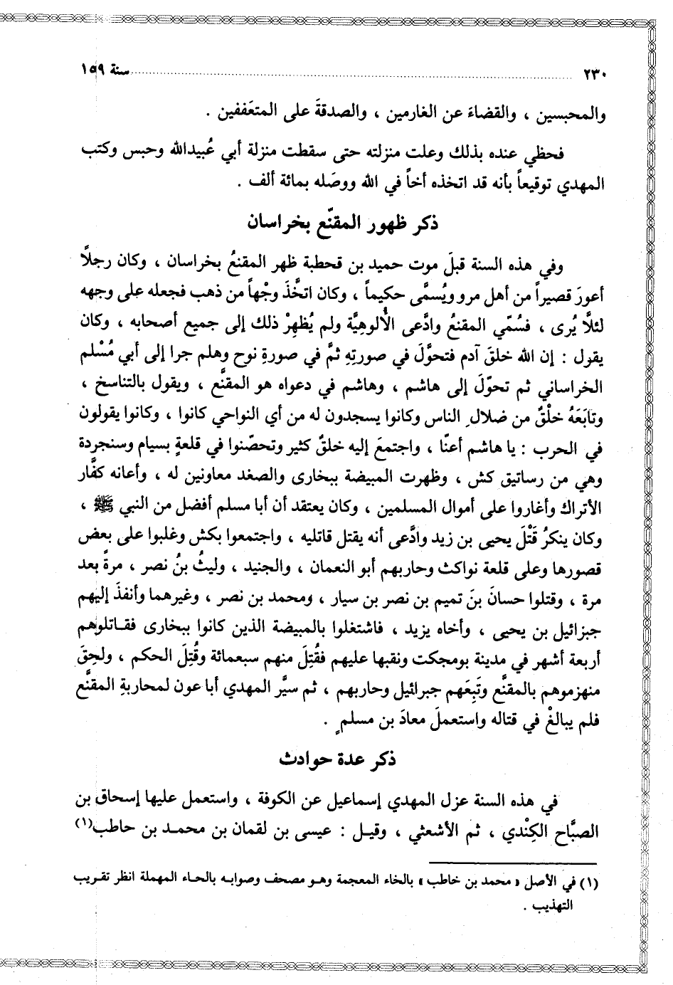 ففي هذه السنة قبل موت حميد بن قحطبة ظهر المقنع بخراسان وكان رجلا أعور قصيرا من أهل مرو ويسمى حكيما وكان اتخذ وجها من ذهب فجعله على وجهه لئلا يرى فسمي المقنع وادعى الألوهية ولم يظهر ذلك إلى جميع أصحابه وكان يقول أن الله خلق آدم فتحول في صورته ثم في صورة نوح وهلم جرا إلى أبي مسلم الخراساني ثم تحول في صورته ثم في سوزرة نوح وهلم جرا إلى أبي مسلم الخراساني ثم تحول إلى هاشم وهاشم في دعواه هو المقنع ويقول بالتناسخ وتابعه خلق من ضلال الناس وكانوا يسجدون له من أي النواحي كانوا وكانوا يقولون في الحرب يا هاشم أعنا واجتمع إليه خلق كثير وتحصنوا في قلعة بسيام وسنجردة وهي من رساتيق كش وظهرت المبيضة ببخارى والصغد معاونين له وأعانه كفار الأتراك وأغاروا على أموال المسلمين وكان يعتقد أن أبا مسلم أفضل من النبي صلى الله عليه وسلم وكان ينكر قتل يحيى بن زيد وادعى أنه يقتل قاتليه واجتمعوا بكش وغلبوا على بعض قصورا وعلى قلعة نواكف وحاربهم أبو النعمان والجنيد وليث بن نصر مرة بعد مرة وقتلوا حسان بن تميم بن نصر بن سيار ومحمد بن نصر وغيرهما وأنفذ إليهم جبزائيل بن يحيى وأخاه يزيد واشتغلوا بالمبيضة الذين كانوا ببخارى فقاتلوهم أربعة أشهر في مدينة بومجكت ونقبها عليهم فقتل منهم سبعمئة وقتل الحكم ولحق منهزموهم بالمقنع وتبعهم جبرائيل وحاربهم ثم سير المهدي أبا عون لمحاربة المقنع فلم يبالغ في قتالهم واستعمل معاذ بن مسلم