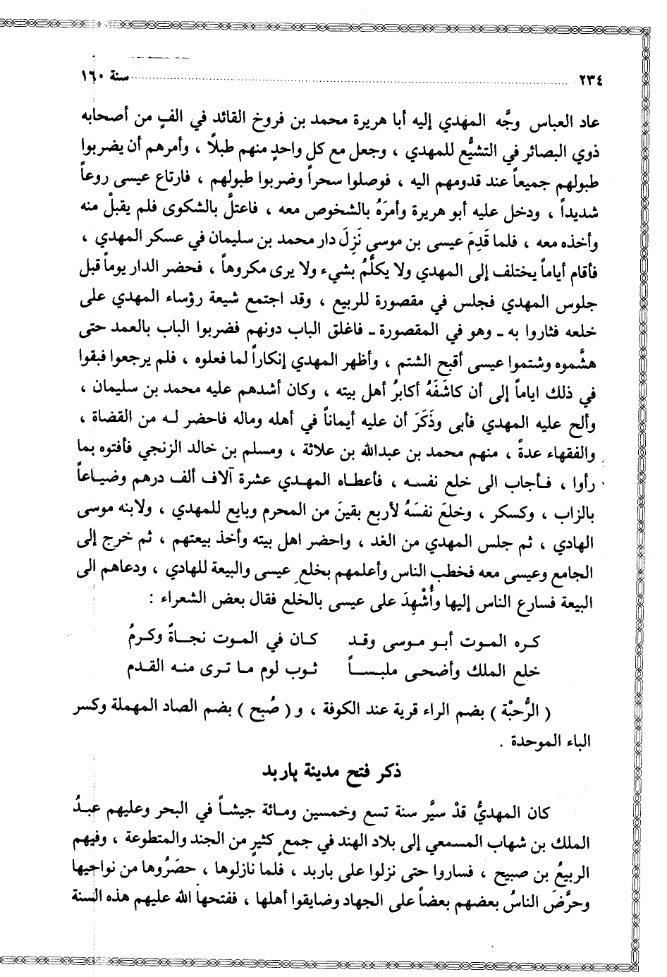 كان المهدي قد سير سنة تسع وخمسين ومائة جيشا في البحر وعليهم عبد الملك بن شهاب المسمعي إلى بلاد الهند في جمع كثير من الجند والمتطوعة وفيهم الربيع بن صبيح فساروا حتى نزلوا على باربد فلما نازلوها حصروها من نواحيها وحرض الناس بعضهم بعضا على الجهاد وضايقوا أهلها ففتحها الله عليهم هذه السنة