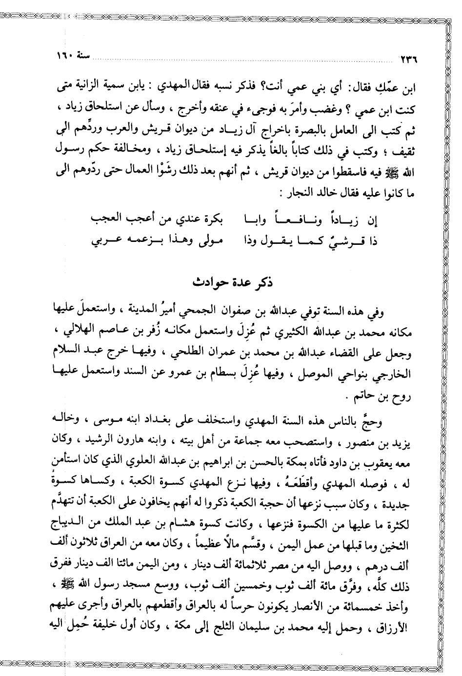 ابن عمك فقال أي بني عمي أنت فذكر نسبه فقال المهدي يابن سمية الزانية متى كنت ابن عمي وغضب وأمر به فوجئ في عنقه واخرج وسأل عن استلحاق زياد ثم كتب إلى العامل بالبصرة باخراج آل زياد من ديوان قريش والعرب وردهم إلى ثقيف وكتب في ذلك كتابا بالغا يذكر فيه استلحاق زياد ومخالفة حكم رسول الله فيه فاسقطوا من ديوان قريش ثم انهم بعد ذلك رشوا العمال حتى ردوهم إلى ما كانوا فقال خالد النجار