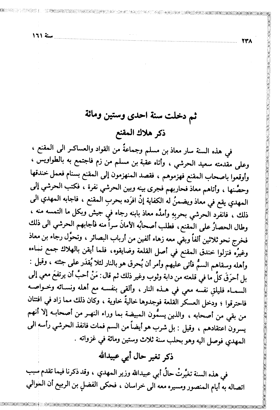 في هذه السنة سار معاذ بن مسلم وجماعة من القواد والعساكر إلى المقنع وعلى مقدمته سعيد الحرشي واتاه عقبة بن مسلم من زم فاجتمع به بالطواويس واوقعوا بأصحاب المقنع فهزموهم فقصد المنهزمون إلى المقنع بسنام فعمل خندقها وحصنها واتاهم معاذ فحاربهم فجرى بينه وبين الحرشي نفرة فكتب الحرشي إلى المهدي يقع في معاذ ويضمن له الكفاية أن افرده بحرب المقنع فأجابه المهدي إلى ذلك فانفرد الحرشي بحربه وامدهخ معاذ بابنه رجاء في جيش وبكل ما التمسه منه وطال الحصار على المقنع فطلب أصحابه الأمان سرا منه فاجابهم الحرشي إلى ذلك فخرج نحو ثلاثين ألفا وبقي معه زهاء ألفين من أرباب البصائر وتحول رجاء بن معاذ وغيره فنزلوا خندق المقنع في اصل القلعة وضايقوه فلما أيقن بالهلاك جمع نساؤه وأهله وسقاهم السم فأتى عليهم وأمر أن يحرق هو بالنار لئلا يقدر على جئته وقيل بل احرق كل ما في قلعته من دابة وثوب وغير ذلك ثم قال من احب أن يرتفع معي إلى السماء فليلق نفسه معي في هذه النار وألقى بنفسه مع أهله ونسائه مع أهله ونسائه وخواصه فاحترقوا ودخل العسكر القلعة فوجدوها خالية خاوية وكان ذلك مما زاد في افتتان من بقي من أصحابه والذين يسمون المبيضة بما وراء النهر من أصحابه إلا انهم يسرون اعتقادهم وقيل بل شرب هو أيضا من السم فمات فانفذ الحرشي رأسه إلى المهدي فوصل إليه وهو بحلب سنة ثلاث وستين ومائة في غزواته