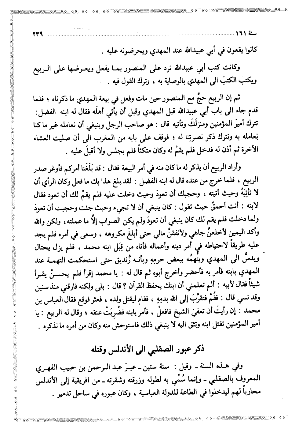 وفي هذه السنة وقيل سنة ستين عبر عبد الرحمن بن حبيب الفهري المعروف بالصقلبي وإنما سمي به لطوله ورزقته وشقرته من افريقية إلى الأندلس محاربا ليدخلوا في الطاعة للدولة العباسية وكان عبوره في ساحل تدمير
