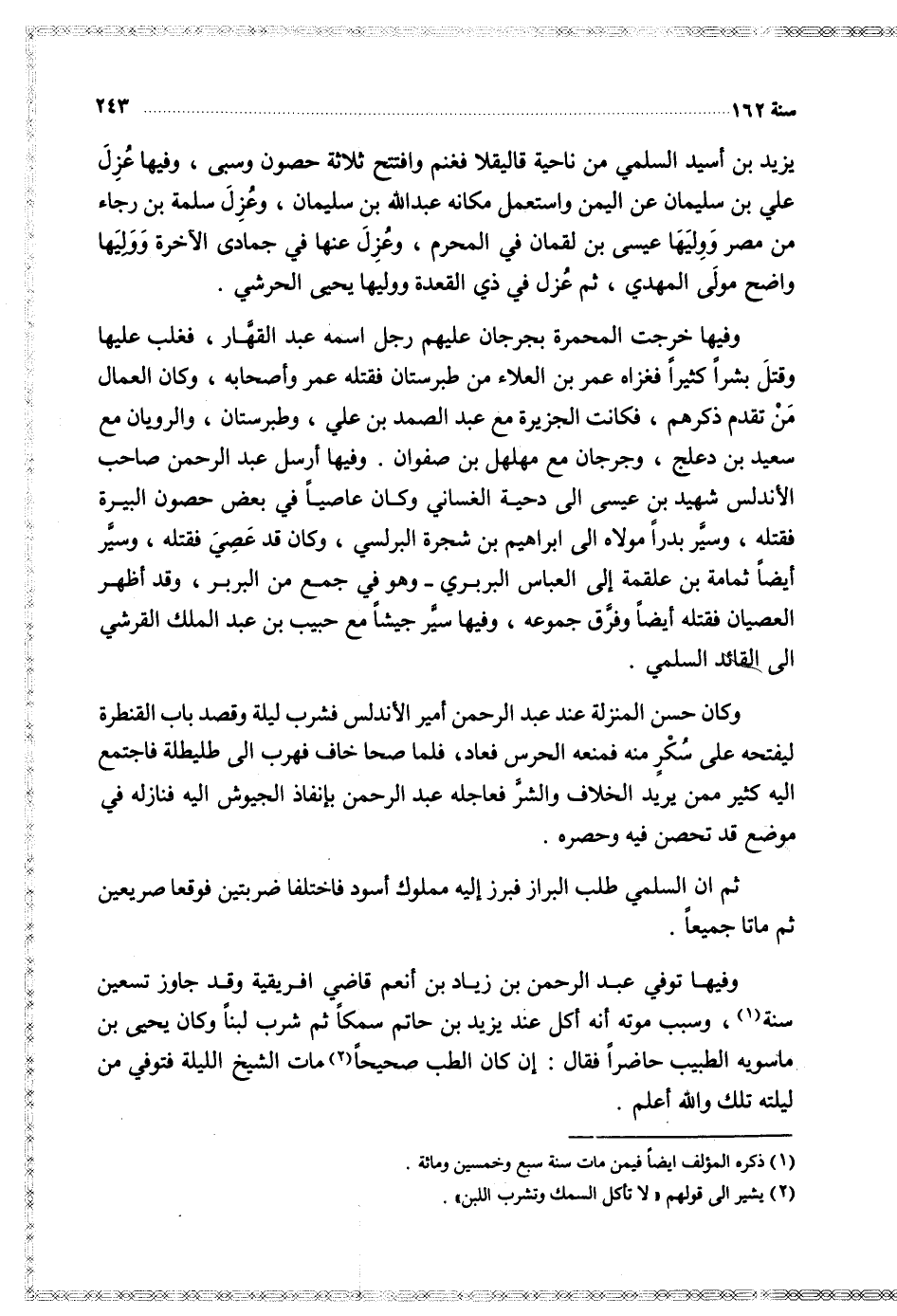 وفيها توفي عبد الرحمن بن زياد بن أنعم قاضي افريقية وق جاوز تسعين سنة وسبب موته أنه أكل عند يزيد بن حاتم سمكا ثم شرب لبنا وكان يحيى بن ماسويه الطبيب حاضرا فقال أن كان الطب صحيحا مات الشيخ الليلة فتوفي من ليلته تلك والله أعلم