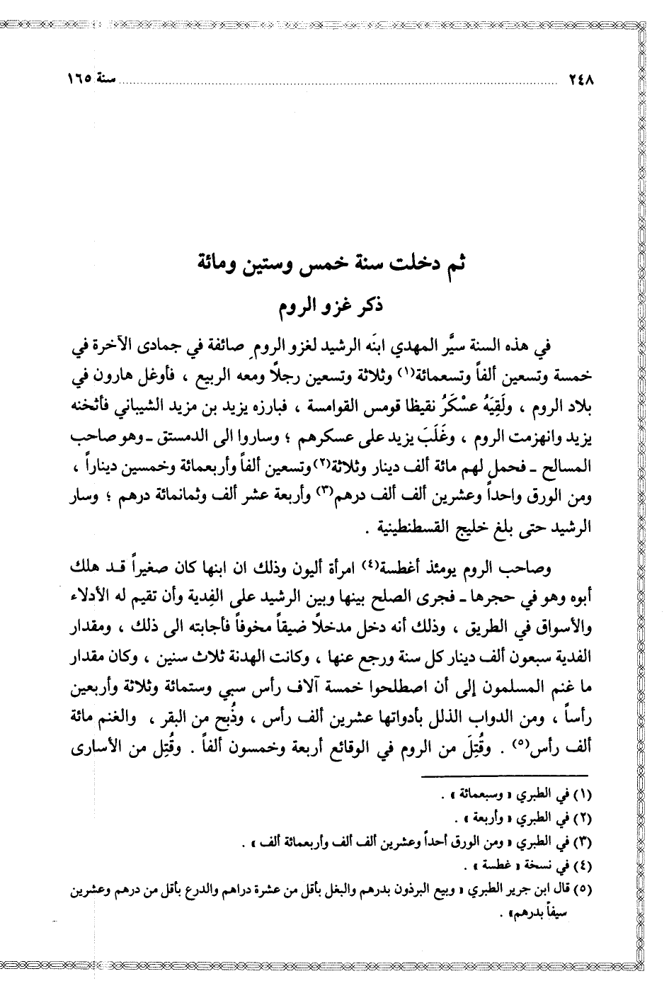 في هذه السنة سير المهدي ابنه الرشيد لغزو الروم ضائفة في جمادى الآخرة في خمسة وتسعين ألفا وتسعمائة وثلاثة وتسعين رجلا ومعه الربيع فأوغل هارون في بلاد الروم ولقيه عسكر نقيظا قومس القوامسة فبارزه يزيد بن مزيد الشيباني فأثخنه يزيد وانهزمت الروم وغلب يزيد على عسكرهم وساروا إلى الدمستق وهو صاحب المسالح فحمل لهم مائة ألف دينار وثلاثة وتسعين ألفا وأربعمائة وخمسين دينارا ومن الورق واحدا وعشرين ألف ألف درهم وأربعة عشر ألف وثمانمائة درهم وسار الرشيد حتى بلغ خليج القسطنطينية
